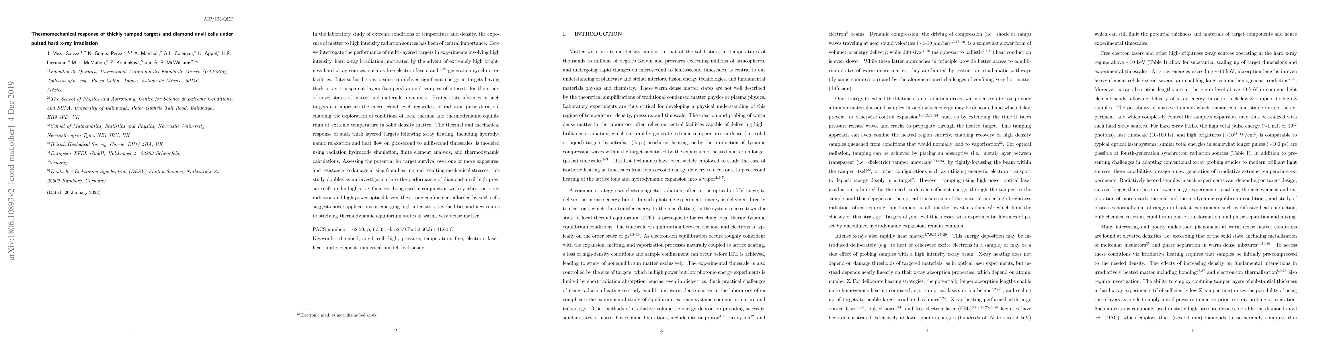 This study investigates the thermomechanical response of thickly tamped targets and diamond anvil cells under high intensity pulsed hard x-ray irradiation, modeling their behavior using radiation hydrocode simulation and finite element analysis. The research aims to assess target durability and the performance of diamond anvil cells in extreme conditions, relevant for studying novel states of matter at high brightness x-ray sources.
