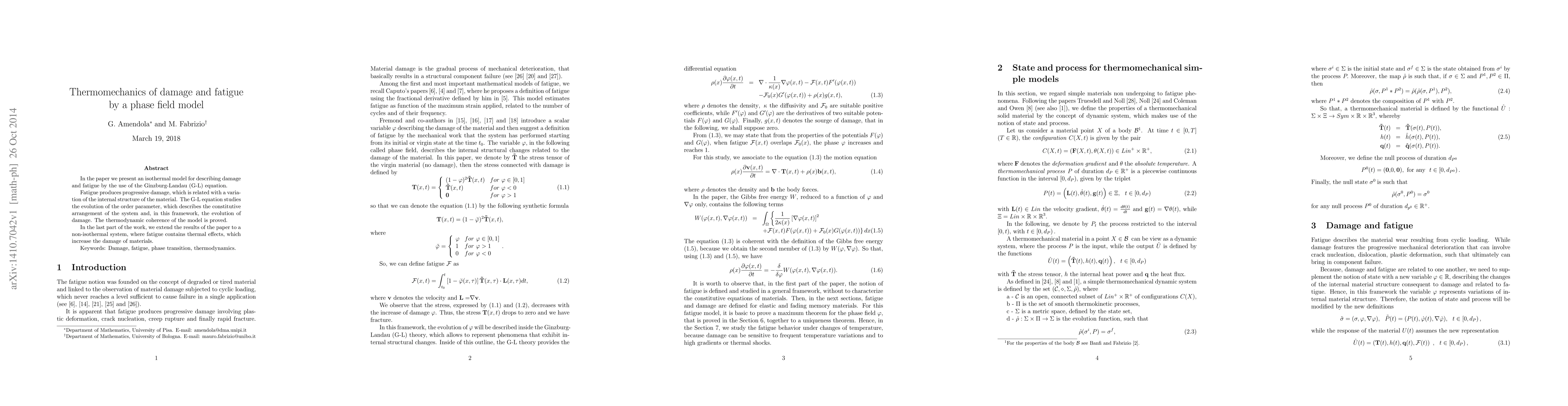 In the paper we present an isothermal model for describing damage and fatigue by the use of the Ginzburg-Landau (G-L) equation. Fatigue produces progressive damage, which is related with a variation of the internal structure of the material. The G-L equation studies the evolution of the order parameter, which describes the constitutive arrangement of the system and, in this framework, the evolution of damage. The thermodynamic coherence of the model is proved. In the last part of the work, we extend the results of the paper to a non-isothermal system, where fatigue contains thermal effects, which increase the damage of materials.