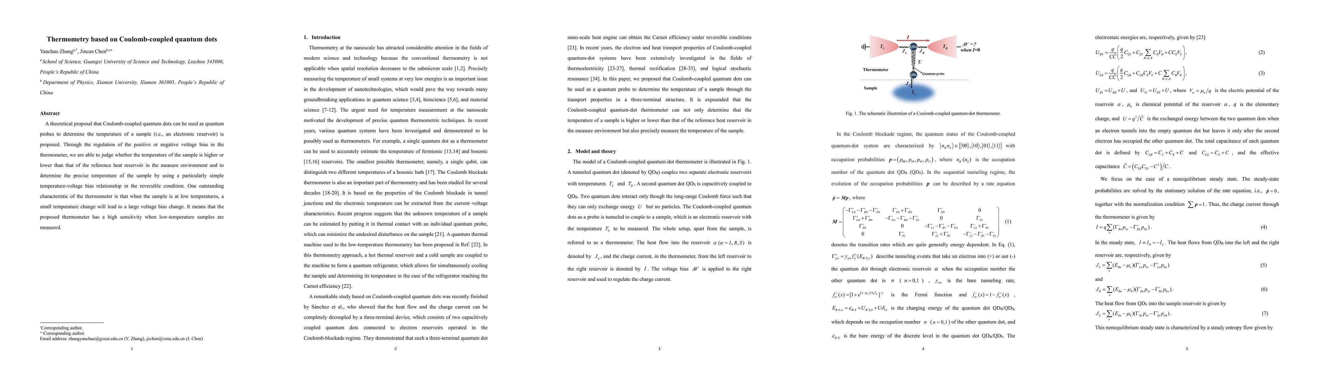 A theoretical proposal that Coulomb-coupled quantum dots can be used as quantum probes to determine the temperature of a sample (i.e., an electronic reservoir) is proposed. Through the regulation of the positive or negative voltage bias in the thermometer, we are able to judge whether the temperature of the sample is higher or lower than that of the reference heat reservoir in the measure environment and to determine the precise temperature of the sample by using a particularly simple temperature-voltage bias relationship in the reversible condition. One outstanding characteristic of the thermometer is that when the sample is at low temperatures, a small temperature change will lead to a large voltage bias change. It means that the proposed thermometer has a high sensitivity when low-temperature samples are measured.