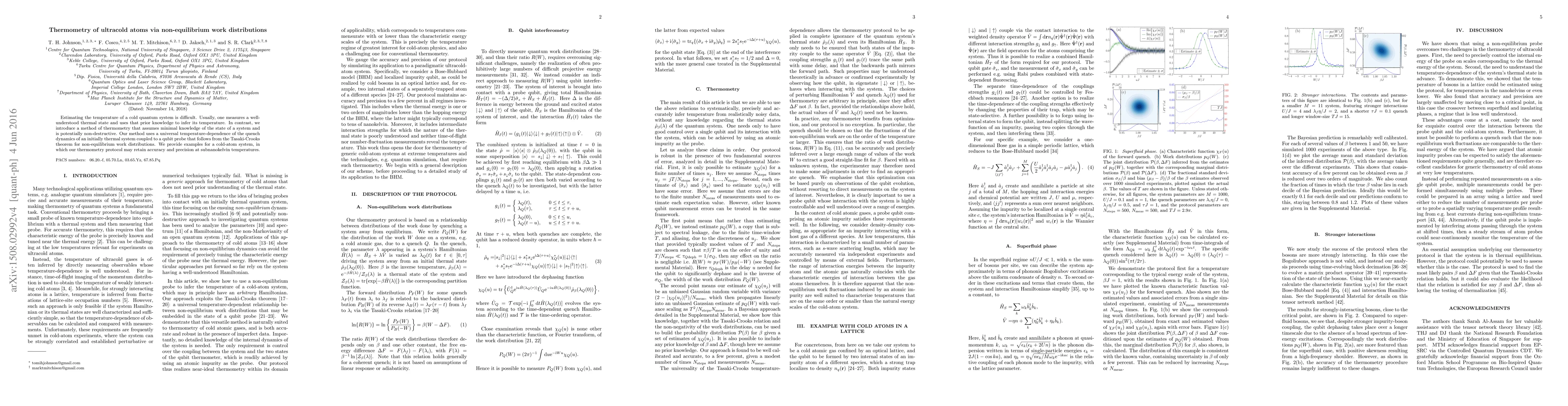 This paper proposes a novel method for thermometry in ultracold quantum systems using non-equilibrium work distributions, which relies on the Tasaki-Crooks theorem. This approach offers a potentially non-destructive way to estimate temperature with minimal prior knowledge of the system state, demonstrated through a cold-atom system.