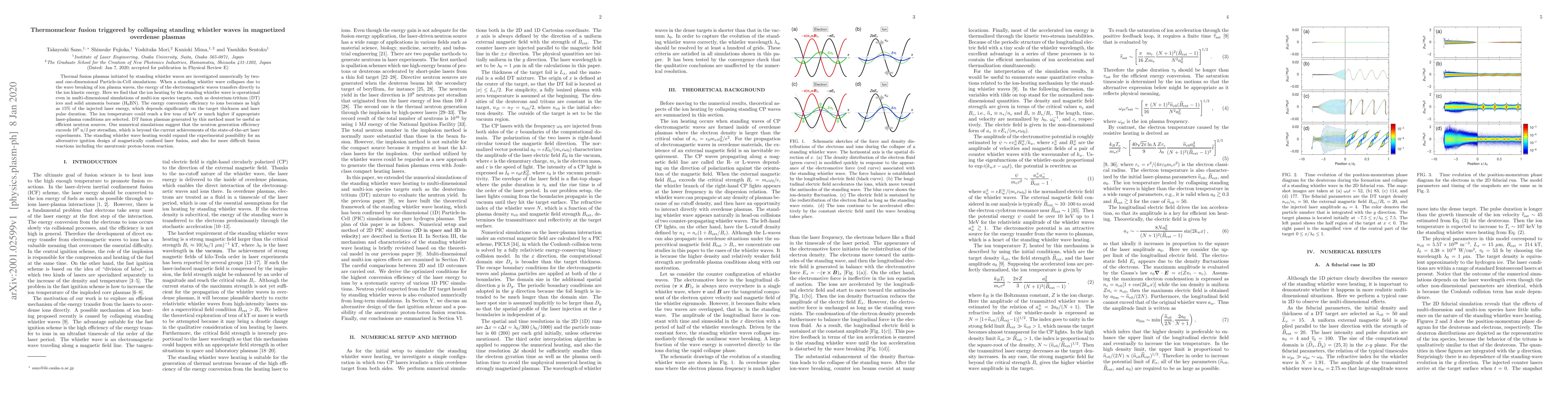 This research investigates the initiation of thermonuclear fusion plasmas via collapsing standing whistler waves in magnetized overdense plasmas, achieving high energy conversion efficiency and neutron generation rates through particle simulations. The method shows potential for efficient neutron sources and alternative ignition designs in fusion experiments.