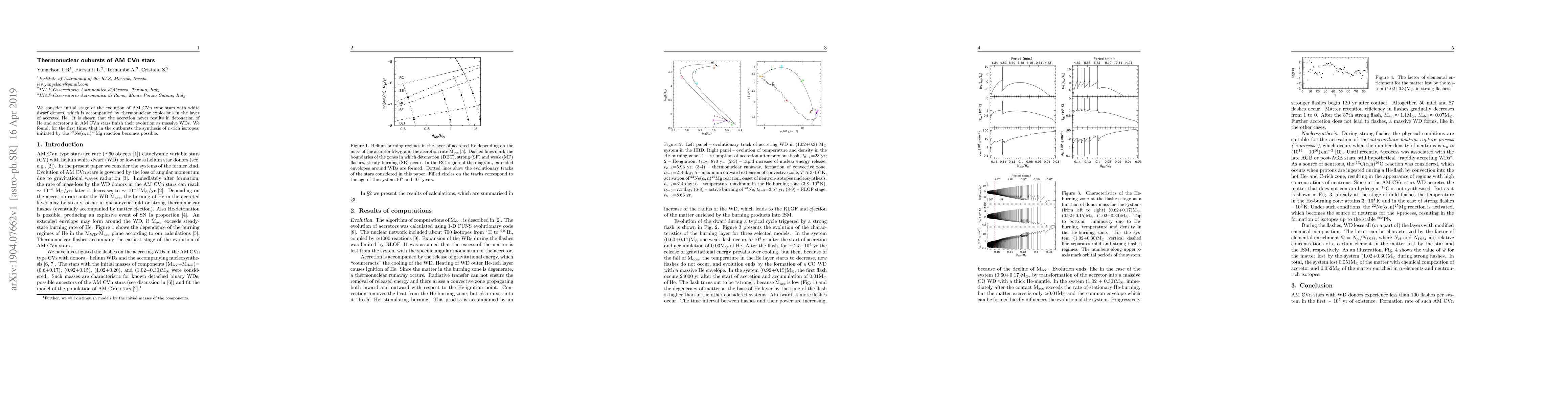 We consider initial stage of the evolution of AM CVn type stars with white dwarf donors, which is accompanied by thermonuclear explosions in the layer of accreted He. It is shown that the accretion never results in detonation of He and accretors in AM CVn stars finish their evolution as massive WDs. We found, for the first time, that in the outbursts the synthesis of n-rich isotopes, initiated by the ${\mathrm{^{22}{Ne}(\alpha,n)^{25}Mg}}$ reaction becomes possible.