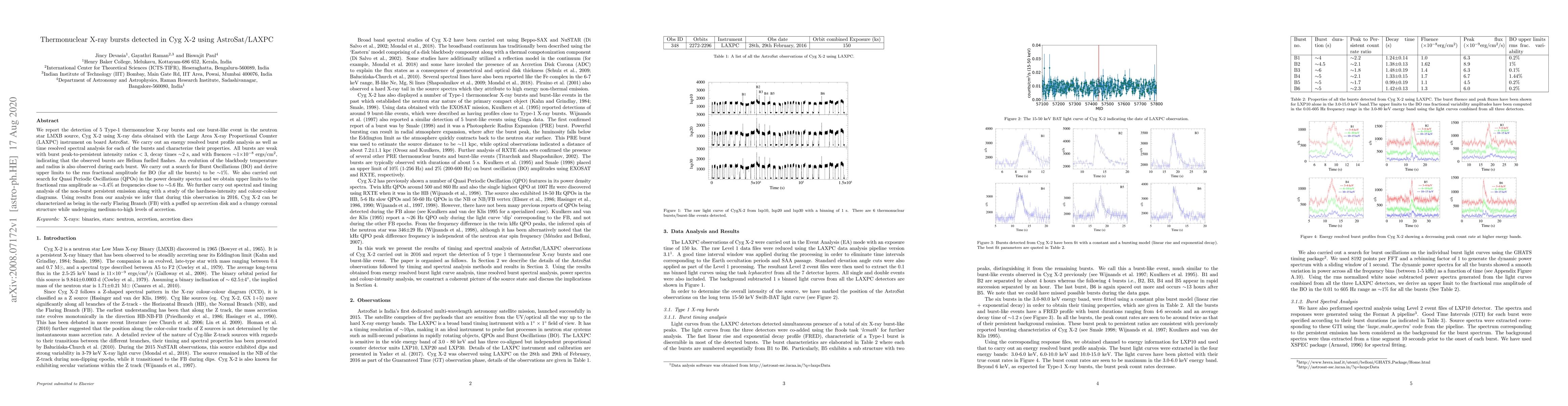 Researchers detected 6 thermonuclear X-ray bursts in neutron star Cyg X-2 using AstroSat/LAXPC, revealing properties of Helium fuelled flashes and suggesting the source is in the early Flaring Branch with a puffed up accretion disk.