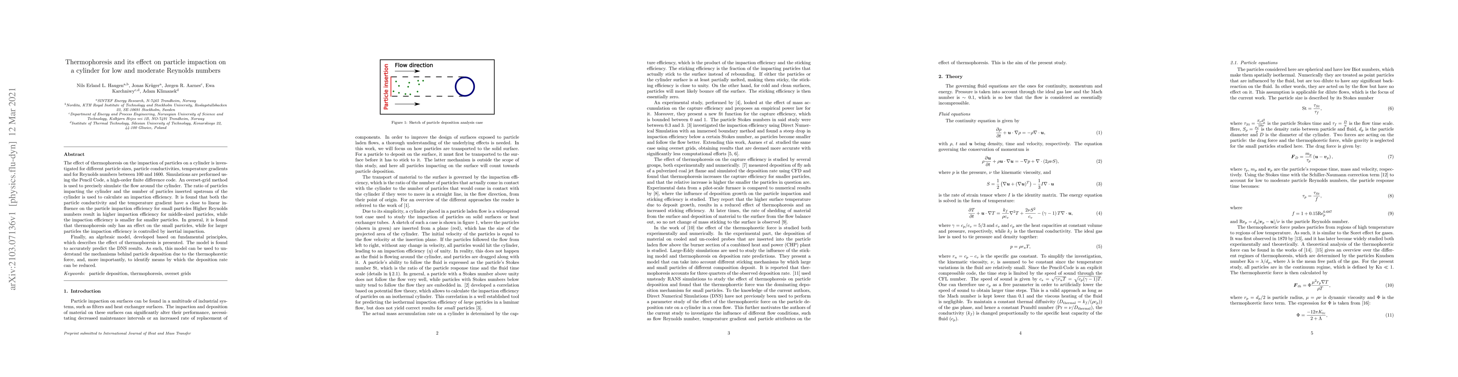 This study investigates the thermophoretic effect on particle impaction on a cylinder for Reynolds numbers between 100 and 1600, finding that thermophoresis significantly influences small particles while inertial impaction dominates for larger particles. An algebraic model developed based on fundamental principles accurately predicts the impaction efficiency and can help reduce deposition rates.