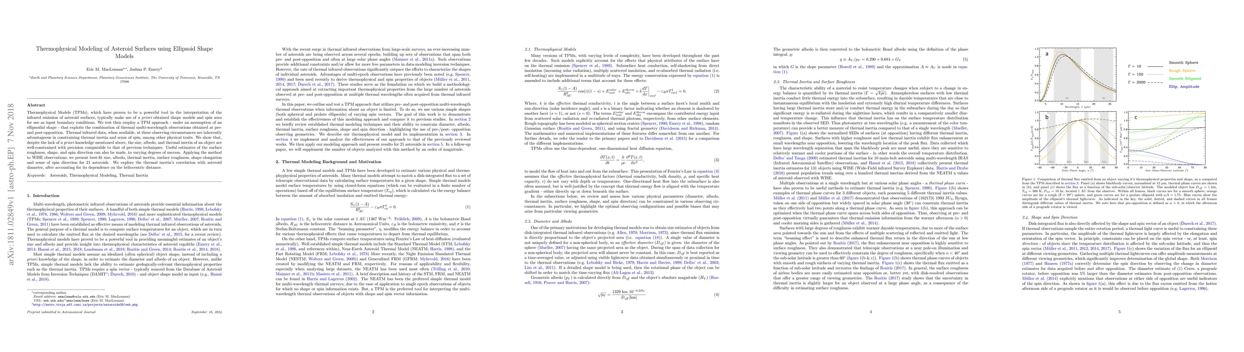 Thermophysical Models (TPMs), which have proven to be a powerful tool in the interpretation of the infrared emission of asteroid surfaces, typically make use of a priori obtained shape models and spin axes for use as input boundary conditions. We test then employ a TPM approach - under an assumption of an ellipsoidal shape - that exploits the combination of thermal multi-wavelength observations obtained at pre- and post-opposition. Thermal infrared data, when available, at these observing circumstances are inherently advantageous in constraining thermal inertia and sense of spin, among other physical traits. We show that, despite the lack of a priori knowledge mentioned above, the size, albedo, and thermal inertia of an object are well-constrained with precision comparable to that of previous techniques. Useful estimates of the surface roughness, shape, and spin direction can also be made, to varying degrees of success. Applying the method to WISE observations, we present best-fit size, albedo, thermal inertia, surface roughness, shape elongation and sense of spin direction for 21 asteroids. We explore the thermal inertia's correlation with diameter, after accounting for its dependance on heliocentric distance.