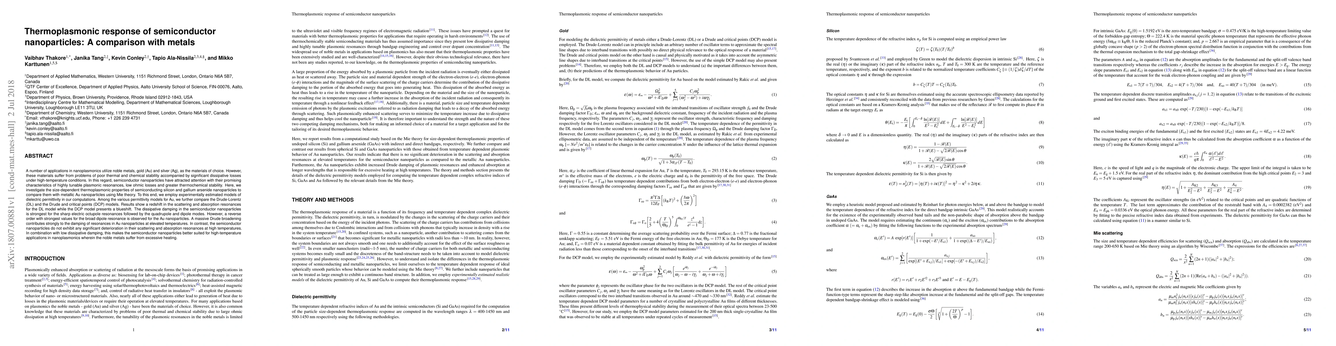 This paper compares the thermoplasmonic behavior of semiconductor nanoparticles (silicon and gallium arsenide) with metallic gold nanoparticles, revealing that semiconductors exhibit greater thermochemical stability and lower dissipative losses at high temperatures, making them more suitable for such applications.