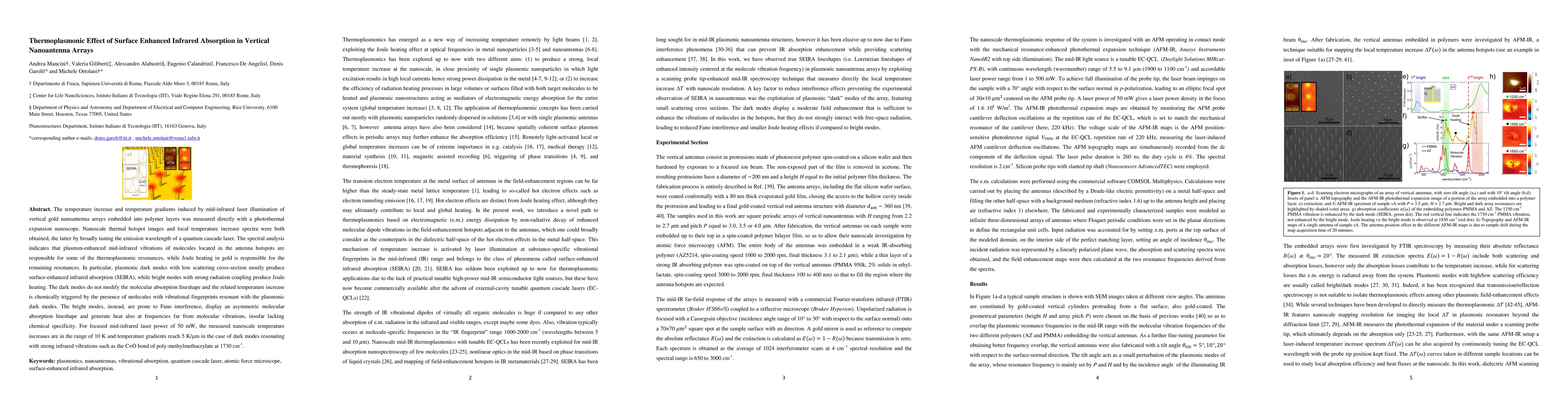 This study investigates the thermoplasmonic effect in vertical gold nanoantenna arrays under mid-infrared laser illumination, revealing that plasmon-enhanced molecular vibrations and Joule heating in gold contribute to distinct thermoplasmonic resonances. Dark modes predominantly enhance infrared absorption, while bright modes induce Joule heating with Fano interference effects.