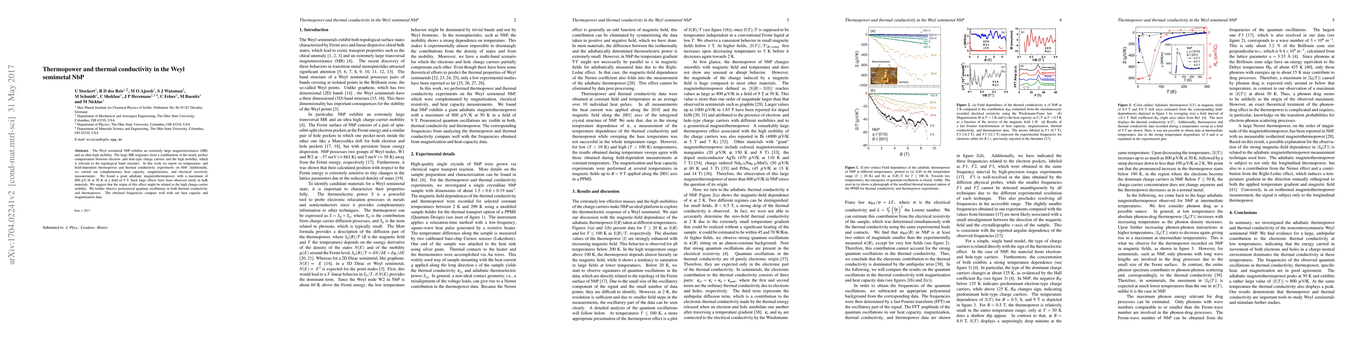 This paper investigates thermopower and thermal conductivity in the Weyl semimetal NbP, revealing a giant adiabatic magnetothermopower of 800 μV/K at 50 K under a 9 T magnetic field, attributed to high charge-carrier mobility and topological band structure effects. Additionally, it reports pronounced quantum oscillations in thermal conductivity and thermopower.