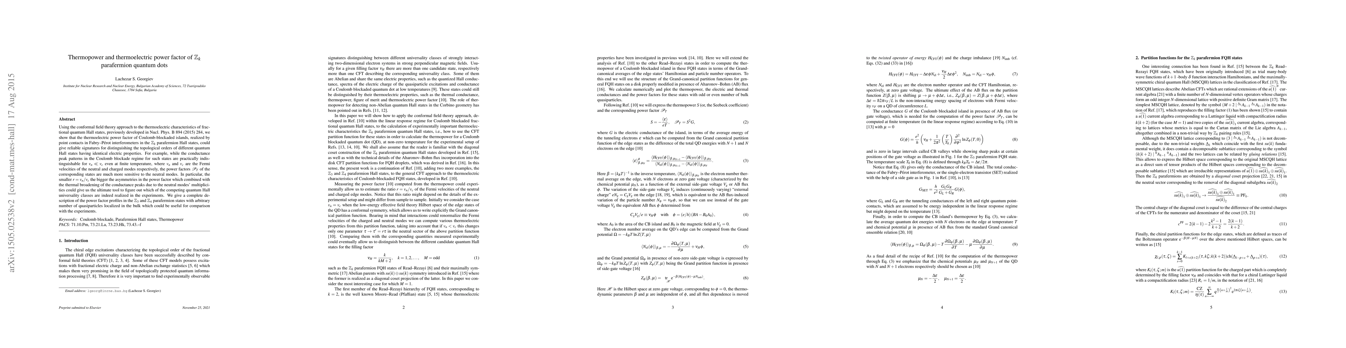 This paper uses conformal field theory to analyze the thermoelectric power factor of ${\mathbb Z}_k$ parafermion quantum dots, showing that it can distinguish topological orders of quantum Hall states with identical electric properties. The study reveals that while conductance peaks are indistinguishable, the thermoelectric power factor is highly sensitive to neutral modes, providing a tool to identify the realized quantum Hall universality classes.