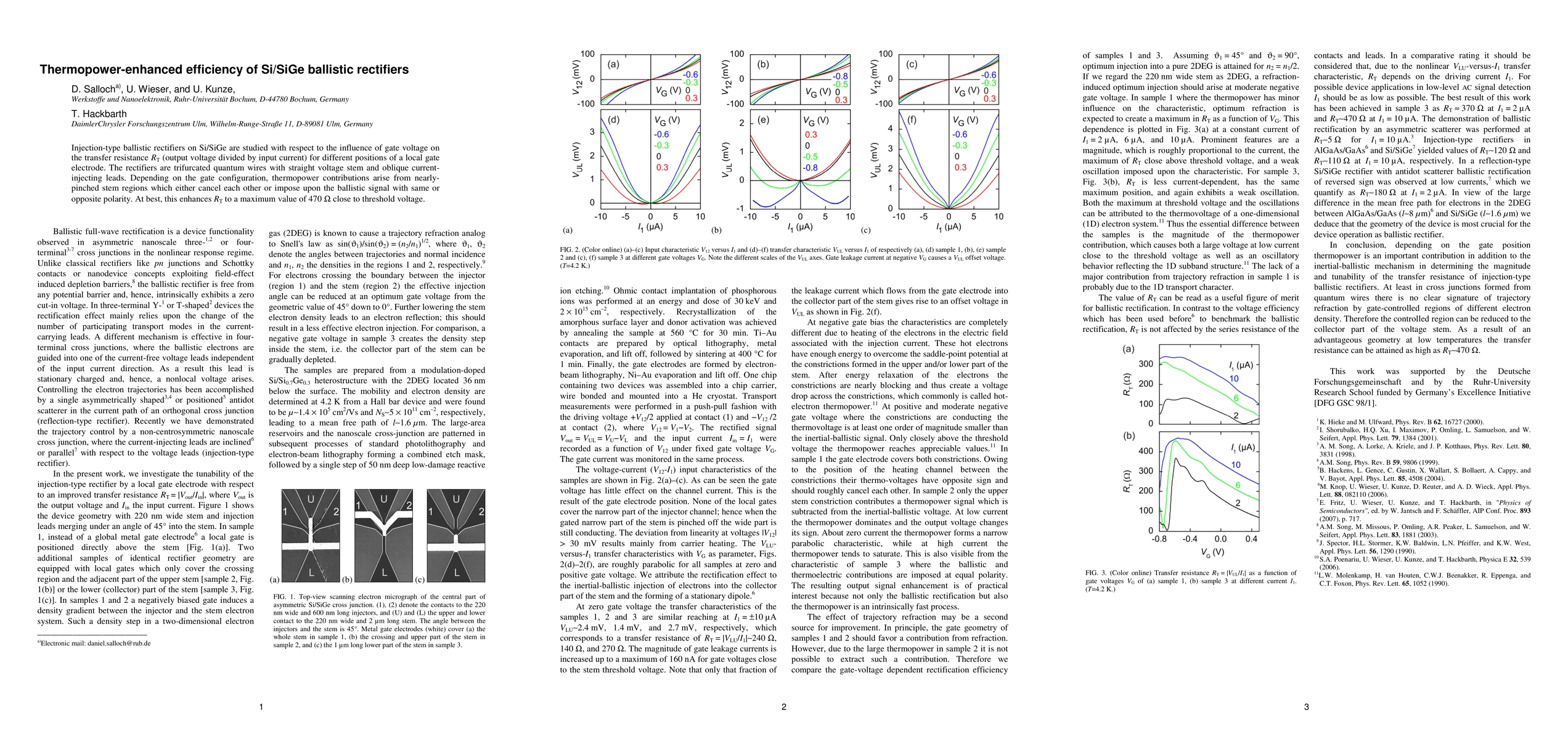 Injection-type ballistic rectifiers on Si/SiGe are studied with respect to the influence of gate voltage on the transfer resistance RT (output voltage divided by input current) for different positions of a local gate electrode. The rectifiers are trifurcated quantum wires with straight voltage stem and oblique current-injecting leads. Depending on the gate configuration, thermopower contributions arise from nearly-pinched stem regions which either cancel each other or impose upon the ballistic signal with same or opposite polarity. At best, this enhances RT to a maximum value of 470 Ohm close to threshold voltage.