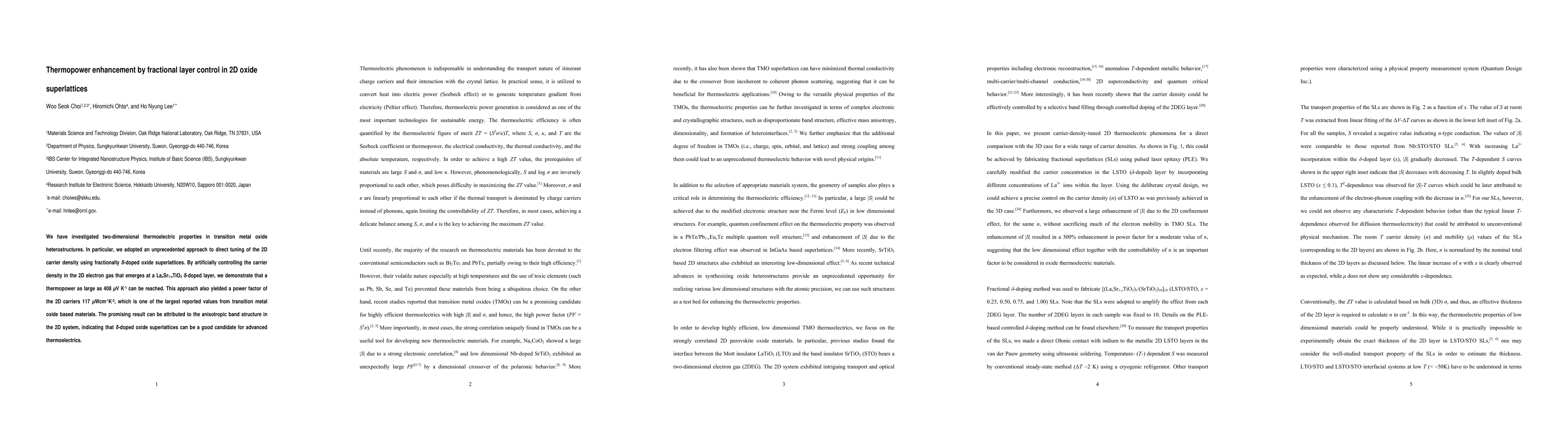 This research explores the thermoelectric properties of transition metal oxide heterostructures, specifically focusing on fractional layer control to tune 2D carrier density. The study demonstrates significant thermopower enhancement up to 408 μV K-1 and a high power factor of 117 μW cm-1 K-2, suggesting δ-doped oxide superlattices as a promising material for advanced thermoelectric applications.