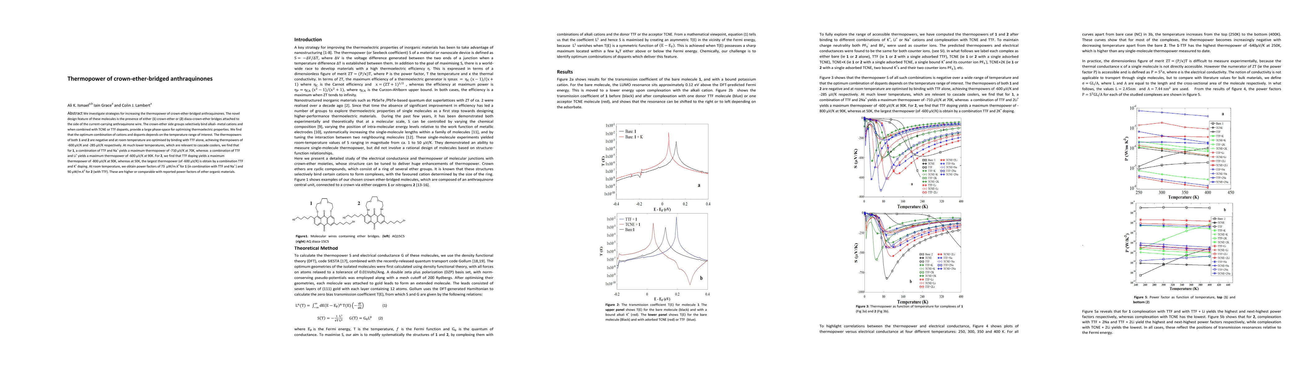 We investigate strategies for increasing the thermopower of crown-ether-bridged anthraquinones. The novel design feature of these molecules is the presence of either (1) crown-ether or (2) diaza-crown-ether bridges attached to the side of the current-carrying anthraquinone wire. The crown-ether side groups selectively bind alkali- metal cations and when combined with TCNE or TTF dopants, provide a large phase-space for optimising thermoelectric properties. We find that the optimum combination of cations and dopants depends on the temperature range of interest. The thermopowers of both 1 and 2 are negative and at room temperature are optimised by binding with TTF alone, achieving thermpowers of -600 microvolts/K and -285 microvolts/K respectively. At much lower temperatures, which are relevant to cascade coolers, we find that for 1, a combination of TTF and Na+ yields a maximum thermopower of -710 microvolts/K at 70K, whereas a combination of TTF and Li+ yields a maximum thermopower of -600 microvolts/K at 90K. For 2, we find that TTF doping yields a maximum thermopower of -800 microvolts/K at 90K, whereas at 50K, the largest thermopower (of -600 microvolts/K) is obtain by a combination TTF and K+ doping. At room temperature, we obtain power factors of 73 microwatts/m.K2 for 1 (in combination with TTF and Na+ ) and 90 microwatts/m.K2 for 2 (with TTF). These are higher or comparable with reported power factors of other organic materials.