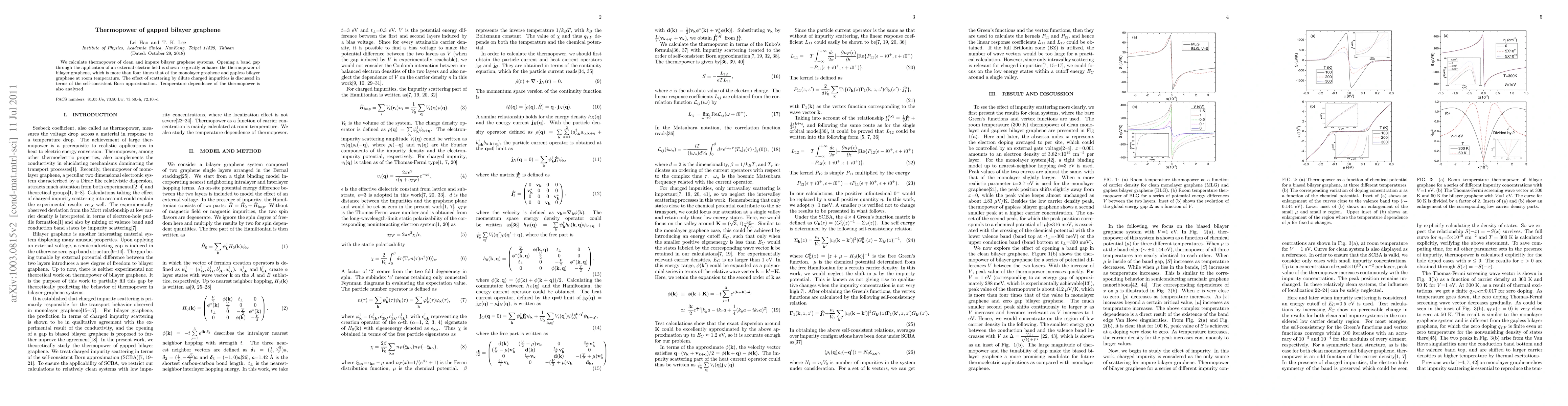 This paper investigates the thermopower of clean and impure bilayer graphene, demonstrating that opening a band gap via an electric field significantly boosts its thermopower, surpassing that of monolayer and gapless bilayer graphene. The study also examines the impact of dilute charged impurities on thermopower using the self-consistent Born approximation and analyzes its temperature dependence.