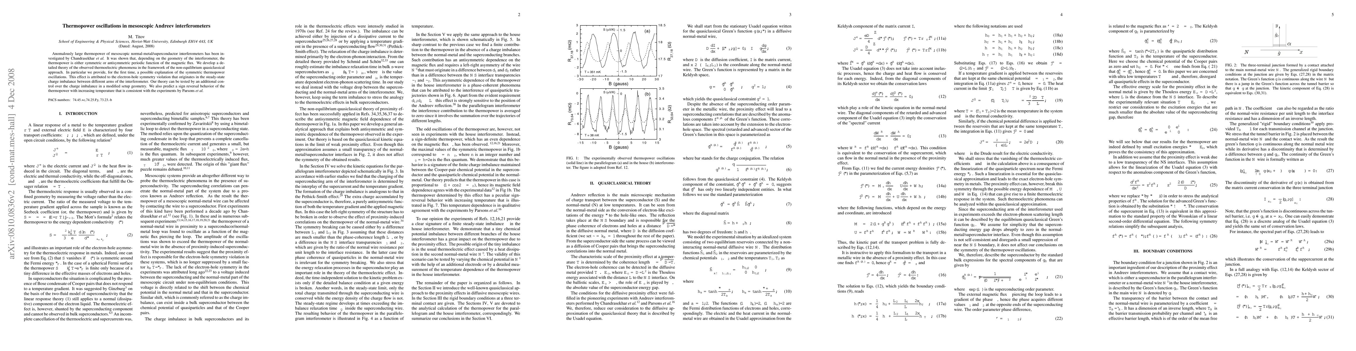 This research investigates thermopower oscillations in mesoscopic Andreev interferometers, revealing periodic behavior dependent on geometry. The study provides a theory explaining symmetric oscillations due to electron-hole symmetry violation and steady-state charge imbalance, and predicts a thermopower sign reversal with temperature increase.