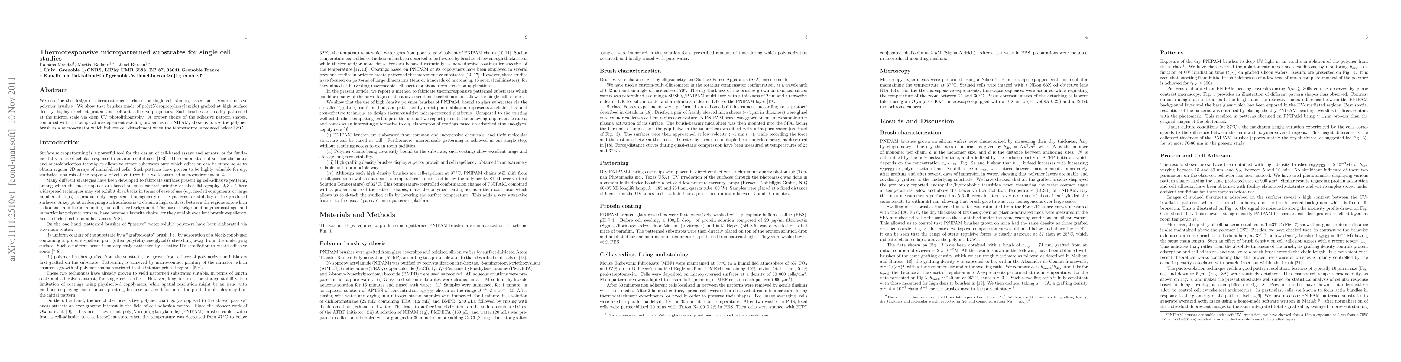 This paper details the creation of thermoresponsive micropatterned surfaces using poly(N-isopropylacrylamide) polymer brushes for single cell studies. The brushes exhibit strong anti-adhesive properties and can be patterned via deep UV photolithography, enabling cell detachment at temperatures below 32°C.