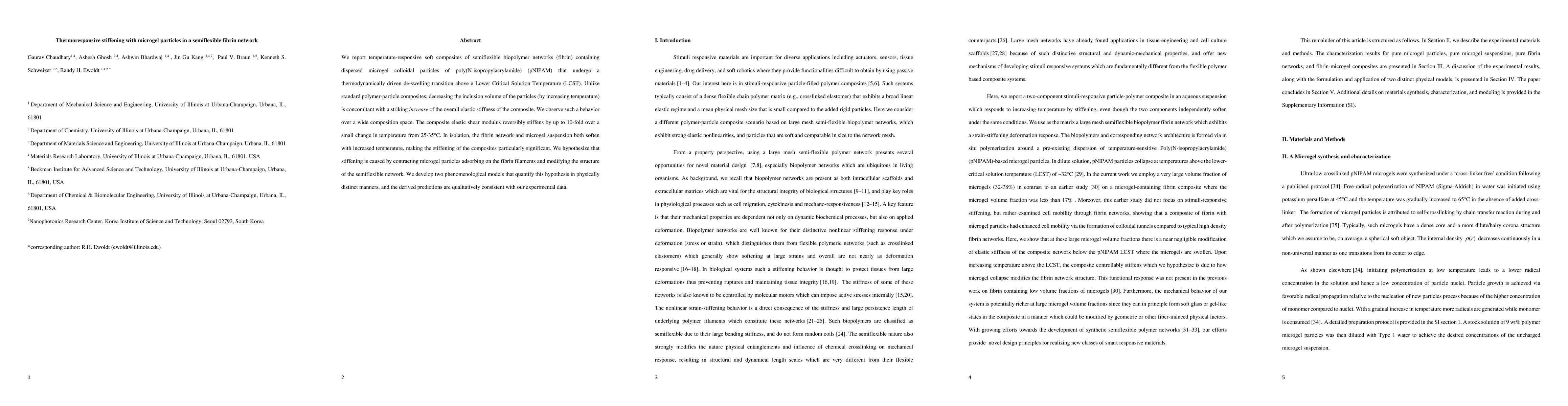 This paper investigates temperature-responsive stiffening in composites of semiflexible fibrin networks with thermoresponsive pNIPAM microgel particles, finding a 10-fold increase in elastic stiffness with temperature rise. The stiffening is hypothesized to result from microgel contraction and adsorption onto fibrin filaments, with two phenomenological models supporting this hypothesis.