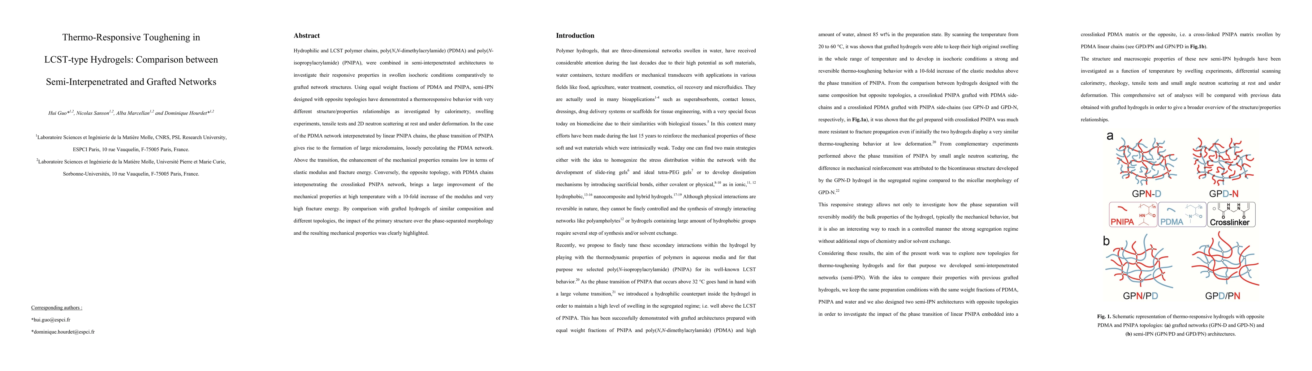 Hydrophilic and LCST polymer chains, poly(N,N-dimethylacrylamide) (PDMA) and poly(Nisopropylacrylamide)(PNIPA), were combined in semi-interpenetrated architectures toinvestigate their responsive properties in swollen isochoric conditions comparatively tografted network structures. Using equal weight fractions of PDMA and PNIPA, semi-IPNdesigned with opposite topologies have demonstrated a thermoresponsive behavior with verydifferent structure/properties relationships as investigated by calorimetry, swellingexperiments, tensile tests and 2D neutron scattering at rest and under deformation. In the caseof the PDMA network interpenetrated by linear PNIPA chains, the phase transition of PNIPAgives rise to the formation of large microdomains, loosely percolating the PDMA network.Above the transition, the enhancement of the mechanical properties remains low in terms ofelastic modulus and fracture energy. Conversely, the opposite topology, with PDMA chainsinterpenetrating the crosslinked PNIPA network, brings a large improvement of themechanical properties at high temperature with a 10-fold increase of the modulus and veryhigh fracture energy. By comparison with grafted hydrogels of similar composition anddifferent topologies, the impact of the primary structure over the phase-separated morphologyand the resulting mechanical properties was clearly highlighted.
