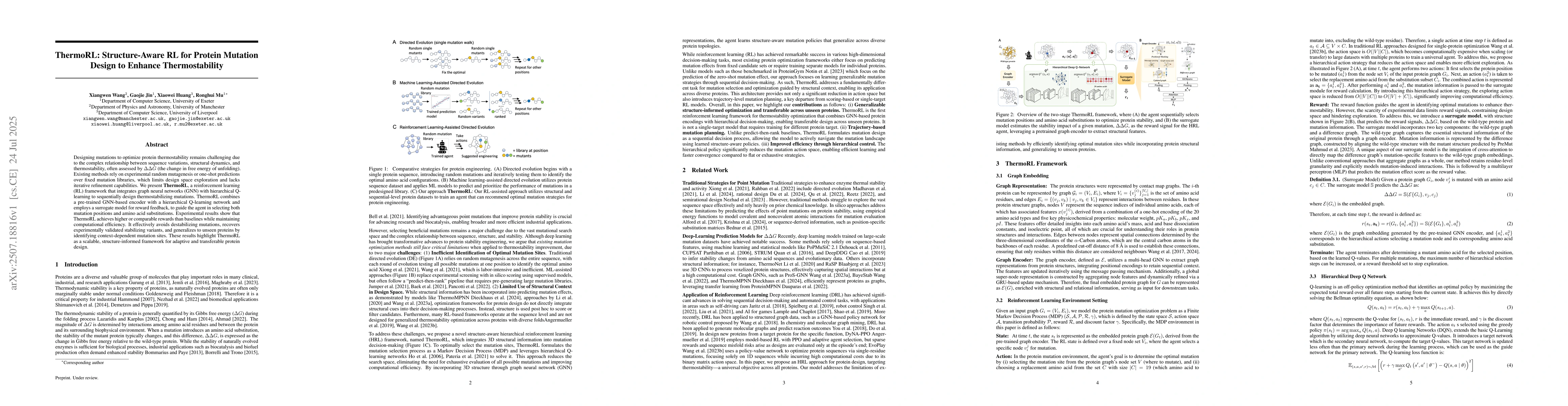 Designing mutations to optimize protein thermostability remains challenging due to the complex relationship between sequence variations, structural dynamics, and thermostability, often assessed by \delta\delta G (the change in free energy of unfolding). Existing methods rely on experimental random mutagenesis or prediction models tested with pre-defined datasets, using sequence-based heuristics and treating enzyme design as a one-step process without iterative refinement, which limits design space exploration and restricts discoveries beyond known variations. We present ThermoRL, a framework based on reinforcement learning (RL) that leverages graph neural networks (GNN) to design mutations with enhanced thermostability. It combines a pre-trained GNN-based encoder with a hierarchical Q-learning network and employs a surrogate model for reward feedback, guiding the RL agent on where (the position) and which (mutant amino acid) to apply for enhanced thermostability. Experimental results show that ThermoRL achieves higher or comparable rewards than baselines while maintaining computational efficiency. It filters out destabilizing mutations and identifies stabilizing mutations aligned with experimental data. Moreover, ThermoRL accurately detects key mutation sites in unseen proteins, highlighting its strong generalizability. This RL-guided approach powered by GNN embeddings offers a robust alternative to traditional protein mutation design.