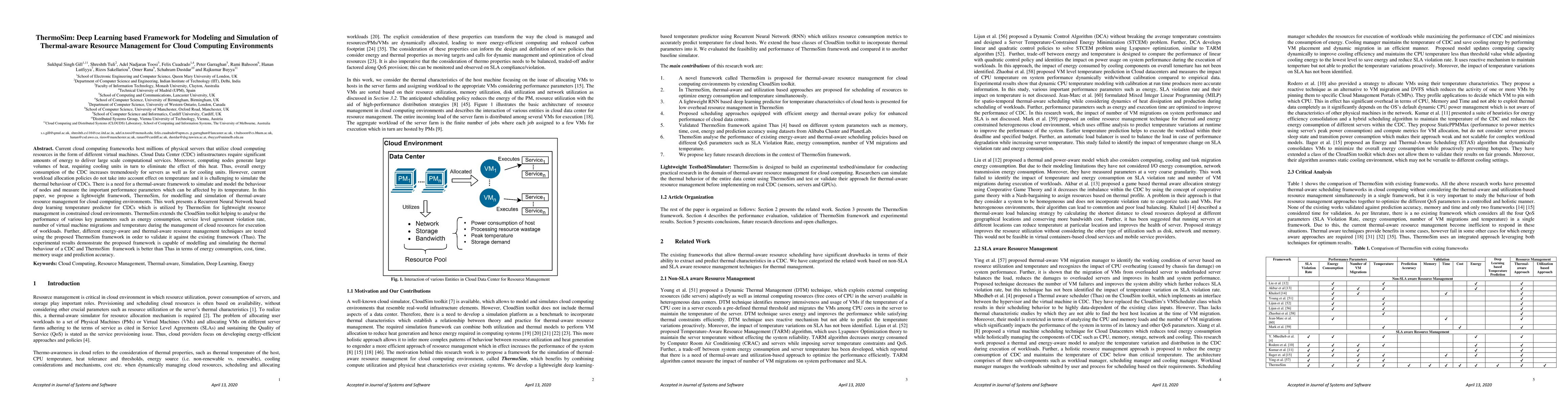 ThermoSim is a deep learning-based framework for thermal-aware resource management in cloud computing environments, utilizing a Recurrent Neural Network to predict temperatures and optimize energy consumption. It extends CloudSim to analyze performance metrics like energy use and SLA violations, demonstrating superior results compared to existing frameworks.