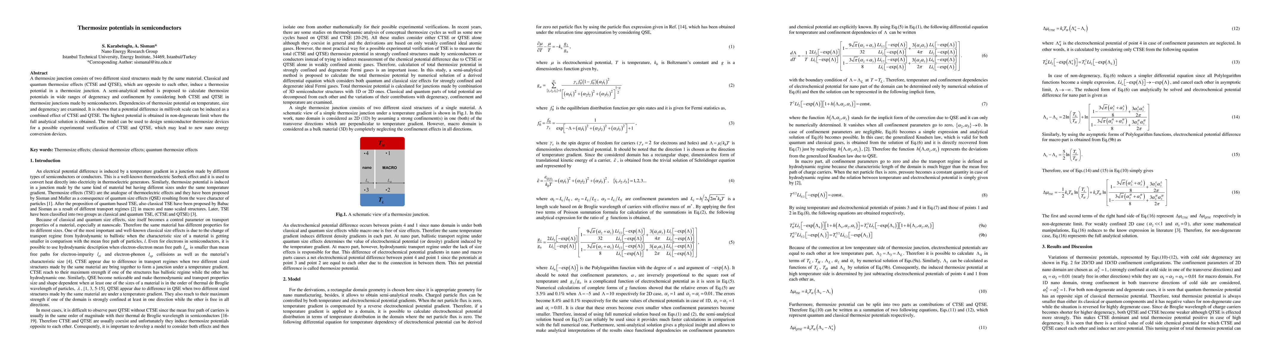 A thermosize junction consists of two different sized structures made by the same material. Classical and quantum thermosize effects (CTSE and QTSE), which are opposite to each other, induce a thermosize potential in a thermosize junction. A semi-analytical method is proposed to calculate thermosize potentials in wide ranges of degeneracy and confinement by considering both CTSE and QTSE in thermosize junctions made by semiconductors. Dependencies of thermosize potential on temperature, size and degeneracy are examined. It is shown that a potential difference in millivolts scale can be induced as a combined effect of CTSE and QTSE. The highest potential is obtained in non-degenerate limit where the full analytical solution is obtained. The model can be used to design semiconductor thermosize devices for a possible experimental verification of CTSE and QTSE, which may lead to new nano energy conversion devices.