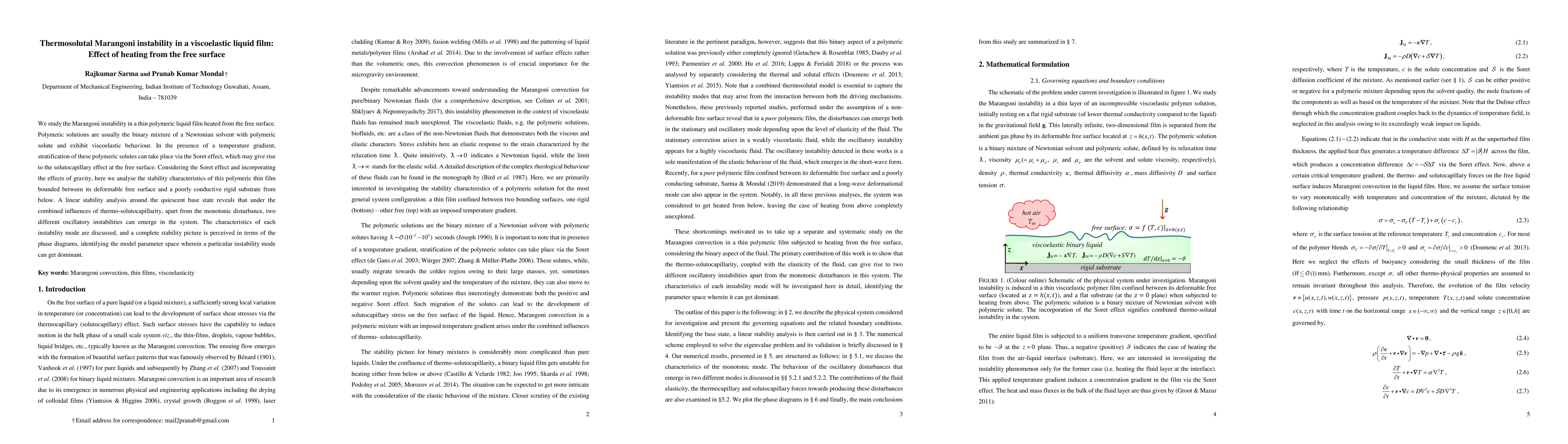 This study investigates the Marangoni instability in viscoelastic polymeric liquid films heated from the free surface, revealing that thermo-solutocapillary effects can lead to both monotonic and oscillatory instabilities. The analysis identifies the parameter space where each instability mode dominates.