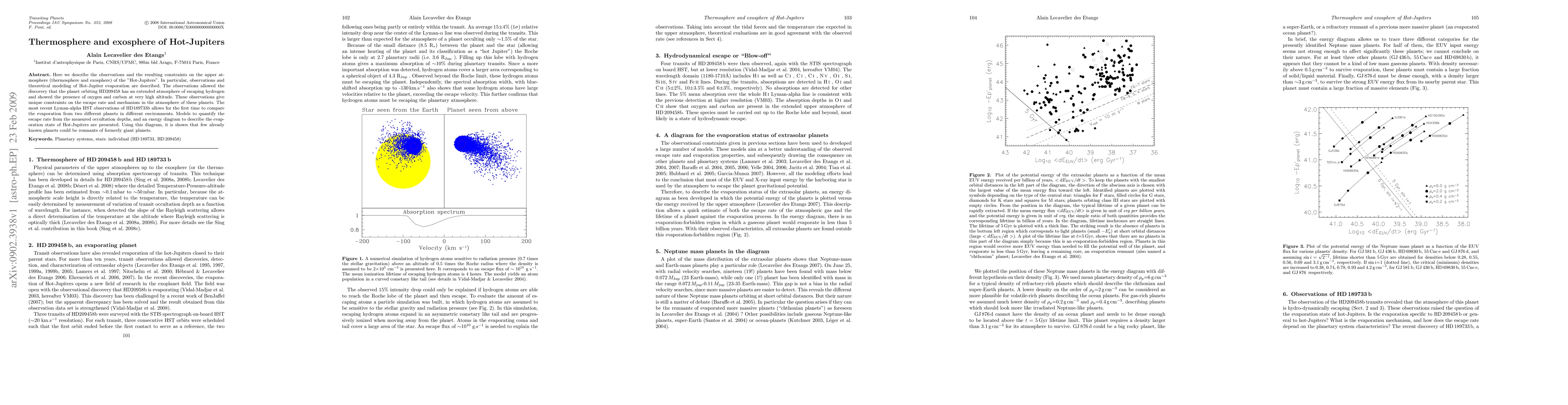 This paper presents observations and models of the upper atmospheres of Hot-Jupiters, revealing an extended atmosphere of escaping hydrogen, oxygen, and carbon in the planet orbiting HD209458. The study uses Lyman-alpha HST observations to compare evaporation rates between HD209458 and HD189733b, providing insights into atmospheric escape mechanisms and suggesting some Hot-Jupiters may be remnants of formerly giant planets.