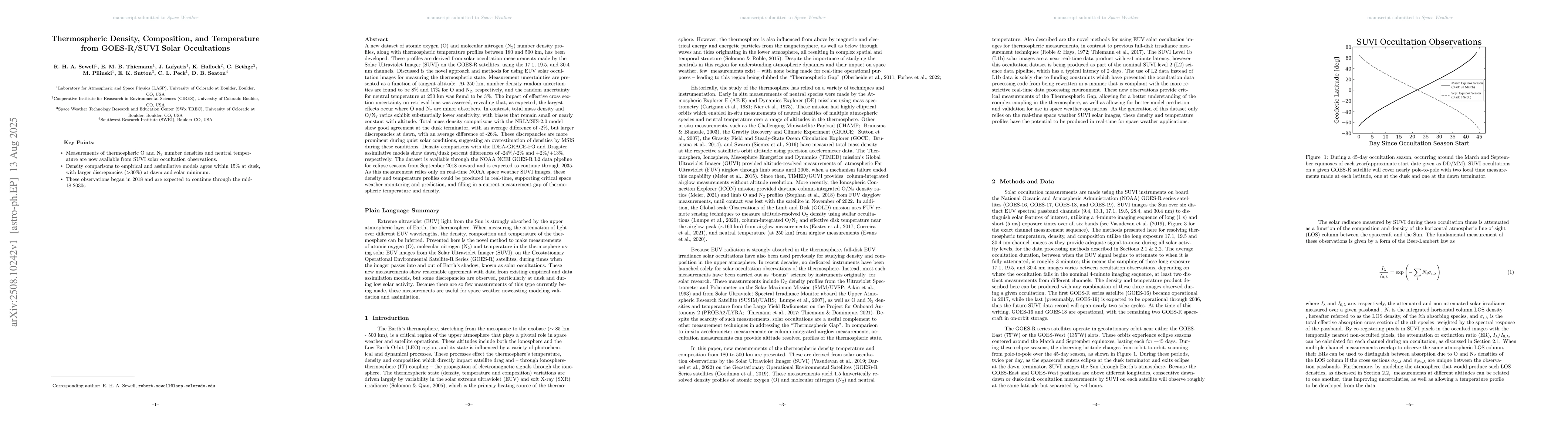 A new dataset of atomic oxygen and molecular nitrogen number density profiles, along with thermospheric temperature profiles between 180 and 500 km, has been developed. These profiles are derived from solar occultation measurements made by SUVI on the GOES-R satellites, using the 17.1, 19.5, and 30.4 nm channels. Discussed is the novel approach and methods for using EUV solar occultation images to measuring the thermospheric state. Measurement uncertainties are presented as a function of tangent altitude. At 250 km, number density random uncertainties are found to be 8% and 17% for O and N2, respectively, and the random uncertainty for neutral temperature at 250 km was found to be 3%. The impact of effective cross section uncertainty on retrieval bias was assessed, revealing that, as expected, the largest effects occur where O and N2 are minor absorbers. In contrast, total mass density and O/N2 ratios exhibit substantially lower sensitivity, with biases that remain small or nearly constant with altitude. Total mass density comparisons with the MSIS model show good agreement at the dusk terminator, with an average difference of -2%, but larger discrepancies at dawn, with an average difference of -26%. These discrepancies are more prominent during quiet solar conditions, suggesting an overestimation of densities by MSIS during these conditions. Density comparisons with the IDEA and Dragster assimilative models show dawn/dusk percent differences of -24%/-2% and +2%/+13%, respectively. The dataset is available through the NOAA GOES-R L2 pipeline for eclipse seasons from Sept. 2018 onward and is expected to continue through 2035. As this measurement relies only on real-time NOAA space weather SUVI images, these profiles could be produced in real-time, supporting critical space weather monitoring and prediction, and filling in a current measurement gap of thermospheric temperature and density.