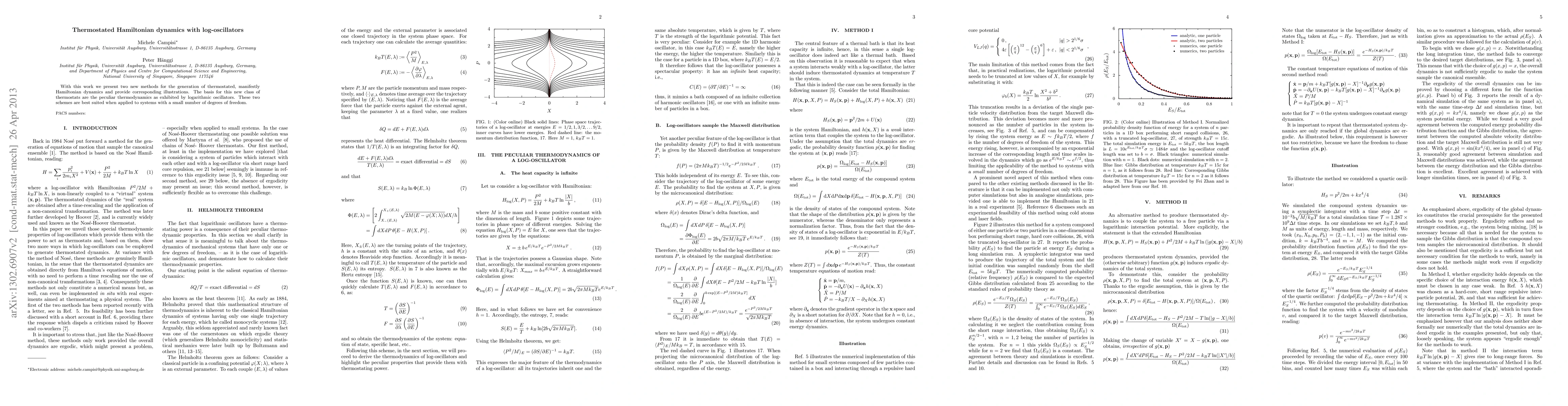 Summary: This paper introduces two novel thermostated Hamiltonian dynamics methods based on the thermodynamics of logarithmic oscillators, designed for systems with few degrees of freedom. The proposed schemes aim to maintain Hamiltonian dynamics while controlling temperature.