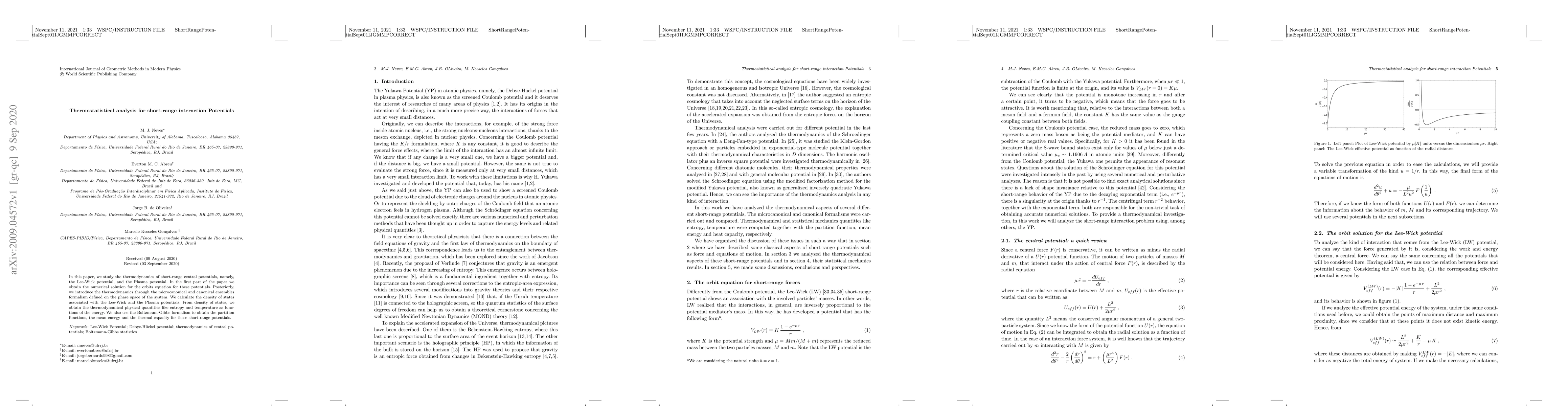 The paper presents a detailed thermostatistical analysis for short-range interaction potentials, providing numerical solutions and thermodynamic quantities for Lee-Wick and Plasma potentials.