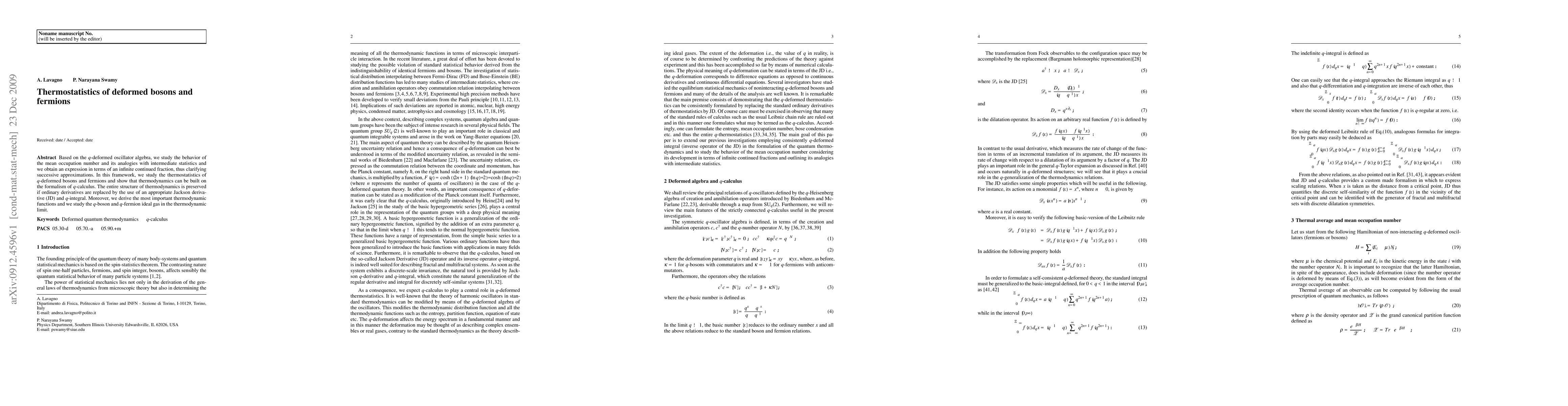 This paper explores the thermostatistics of q-deformed bosons and fermions using q-deformed oscillator algebra, deriving expressions in terms of an infinite continued fraction. It demonstrates that thermodynamics retains its structure when ordinary derivatives are replaced by Jackson derivatives and q-integrals, and it analyzes the behavior of q-boson and q-fermion ideal gases.