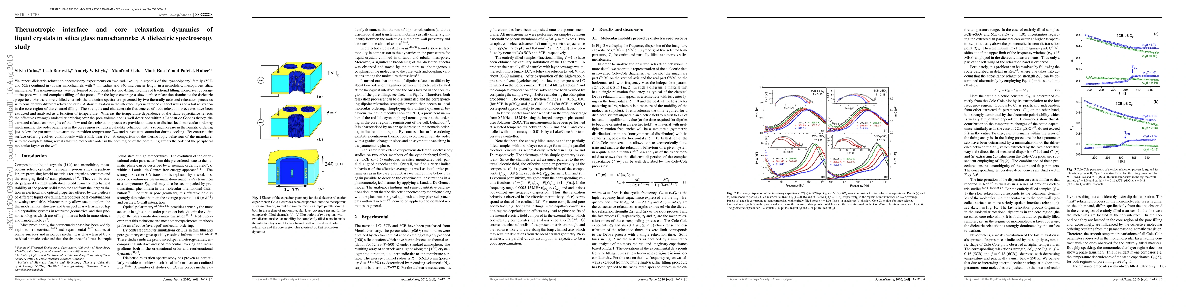 This study uses dielectric spectroscopy to investigate the relaxation dynamics of two cyanobiphenyl liquid crystals confined in silica glass nanochannels. It reveals two distinct relaxation processes: a slow surface relaxation and a fast core relaxation, with different temperature dependencies, highlighting different local molecular ordering mechanisms.