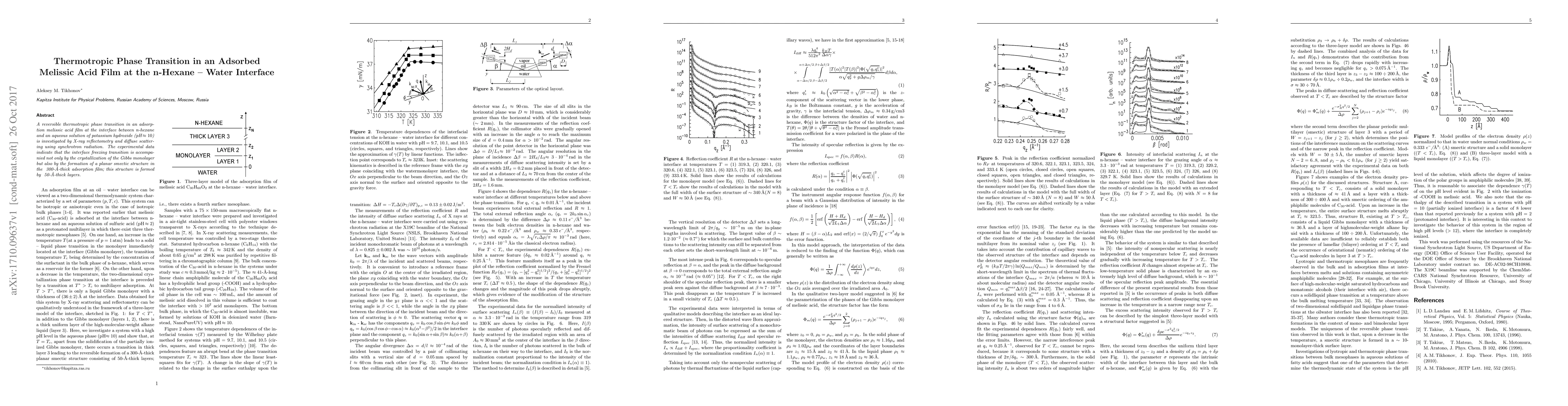 This study investigates a reversible thermotropic phase transition in an adsorbed melissic acid film at the n-hexane-water interface using synchrotron radiation. The transition results in both crystallization of the Gibbs monolayer and formation of a planar smectic structure composed of ~50-Angstrom-thick layers within a ~300-Angstrom-thick film.