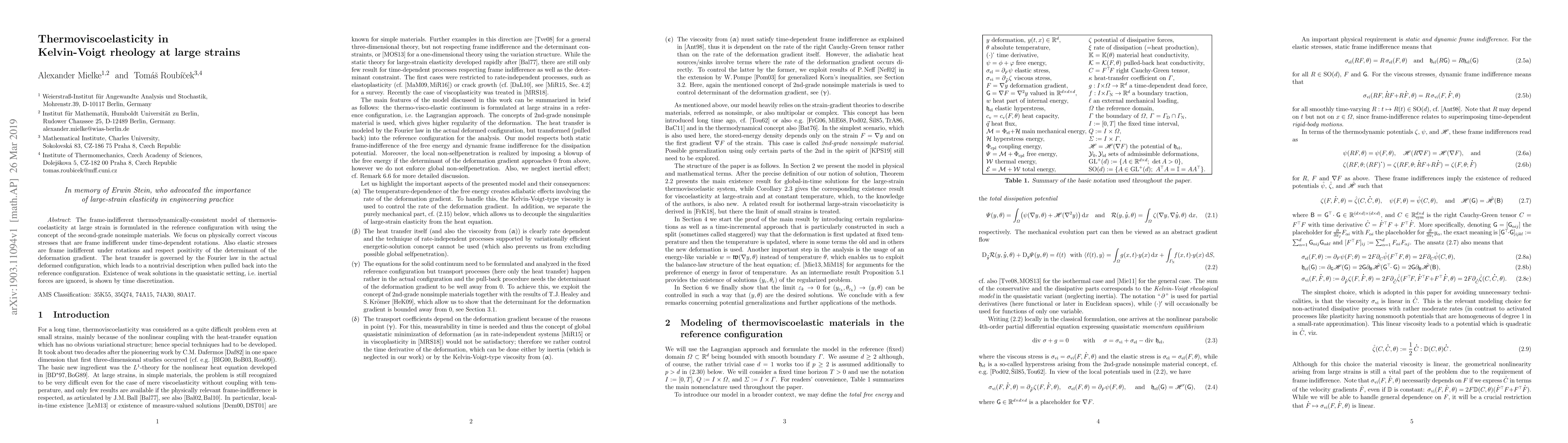 The frame-indifferent thermodynamically-consistent model of thermoviscoelasticity at large strain is formulated in the reference configuration with using the concept of the second-grade nonsimple materials. We focus on physically correct viscous stresses that are frame indifferent under time-dependent rotations. Also elastic stresses are frame indifferent under rotations and respect positivity of the determinant of the deformation gradient. The heat transfer is governed by the Fourier law in the actual deformed configuration, which leads to a nontrivial description when pulled back into the reference configuration. Existence of weak solutions in the quasistatic setting, i.e.\ inertial forces are ignored, is shown by time discretization.