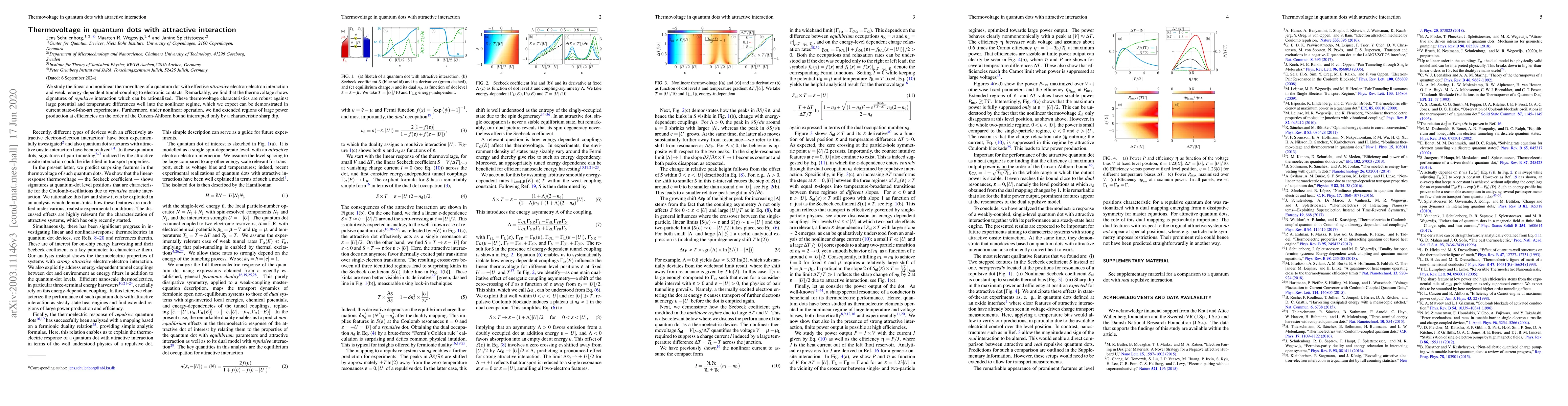 The research explores thermovoltage in quantum dots with attractive electron-electron interaction, finding that thermovoltage characteristics resemble repulsive interaction. These effects are robust under varying potential and temperature differences, potentially observable in advanced experiments. Nonlinear operation reveals extended power production regions with efficiencies near the Curzon-Ahlborn bound, punctuated by a distinct dip.