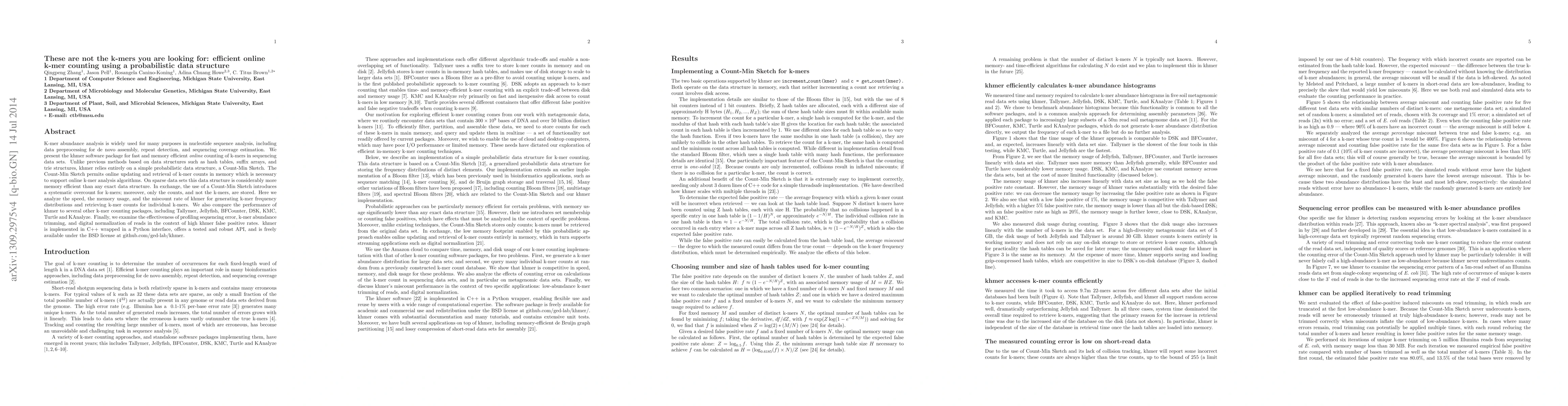 The khmer software package uses a Count-Min Sketch probabilistic data structure for efficient online k-mer counting in sequencing data, offering significant memory savings compared to exact methods, albeit with a systematic overcount. Performance comparisons with other k-mer counting tools highlight khmer's advantages in speed and memory efficiency.