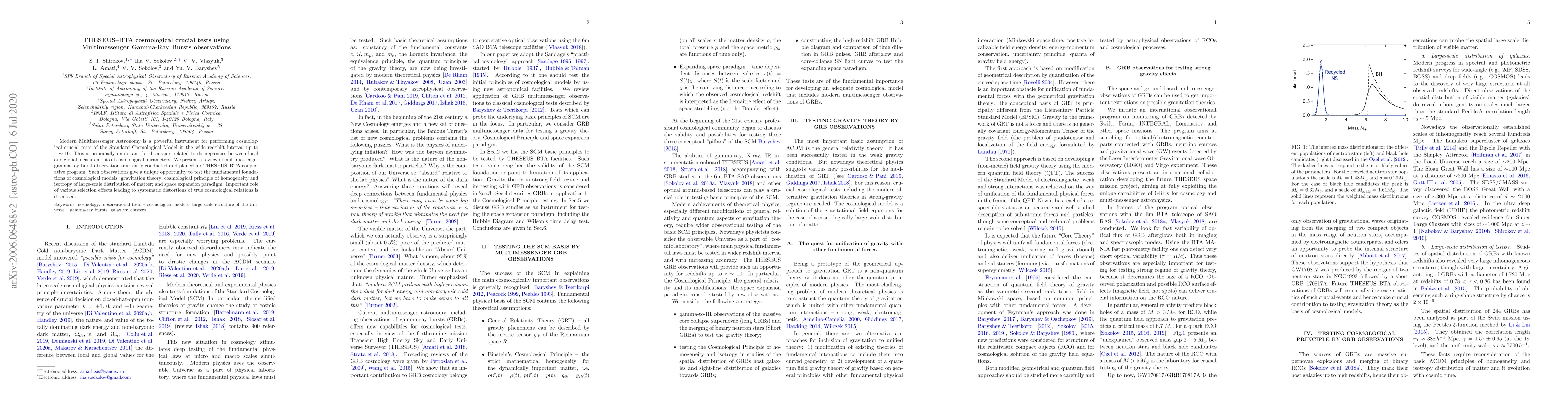 Modern Multimessenger Astronomy is a powerful instrument for performing cosmological crucial tests of the Standard Cosmological Model in the wide redshift interval up to $z \sim 10$. This is principally important for discussion related to discrepancies between local and global measurements of cosmological parameters. We present a review of multimessenger gamma-ray burst observations currently conducted and planed for THESEUS$-$BTA cooperative program. Such observations give a unique opportunity to test the fundamental foundations of cosmological models: gravitation theory; cosmological principle of homogeneity and isotropy of large-scale distribution of matter; and space expansion paradigm. Important role of various selection effects leading to systematic distortions of true cosmological relations is discussed.