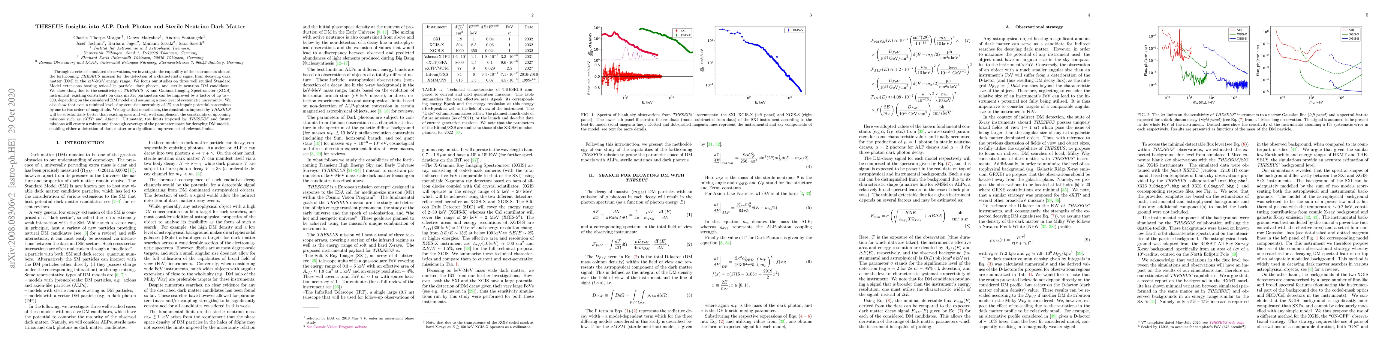 The research explores THESEUS mission's potential to detect dark matter signals in the keV-MeV range, focusing on axion-like particles, dark photons, and sterile neutrinos. It demonstrates that THESEUS' XGIS instrument could enhance existing constraints on dark matter parameters by up to ~300, despite potential 1% systematic uncertainties still impacting results.