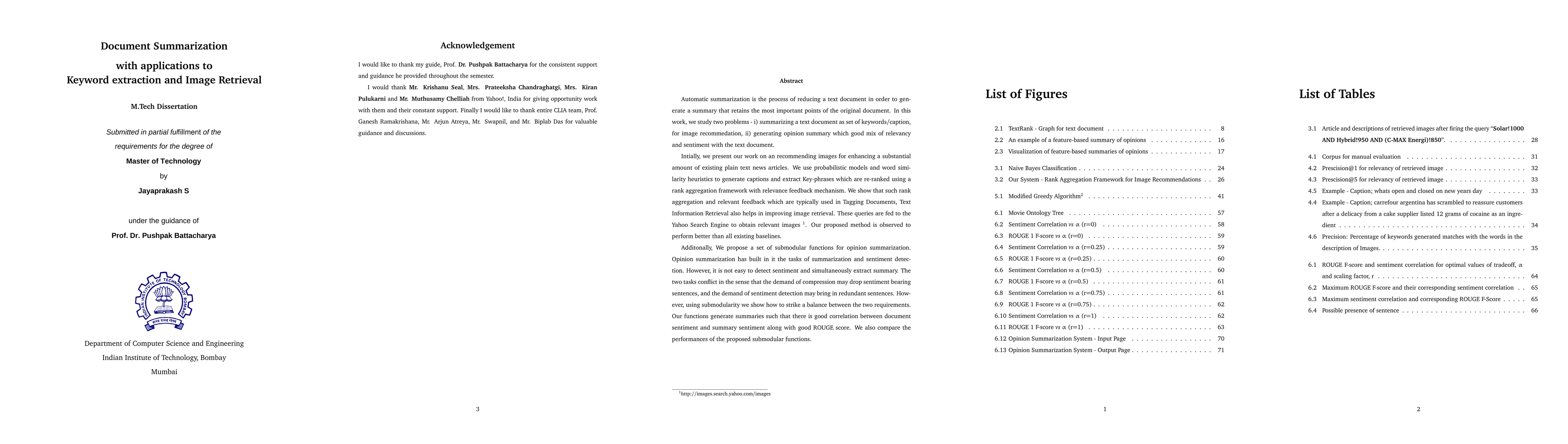 This paper presents an automatic summarization method to generate keyword captions and key-phrases for image retrieval and opinion summarization. The method leverages probabilistic models and rank aggregation for improved image recommendations and submodular functions for balancing summarization and sentiment detection, outperforming existing baselines.