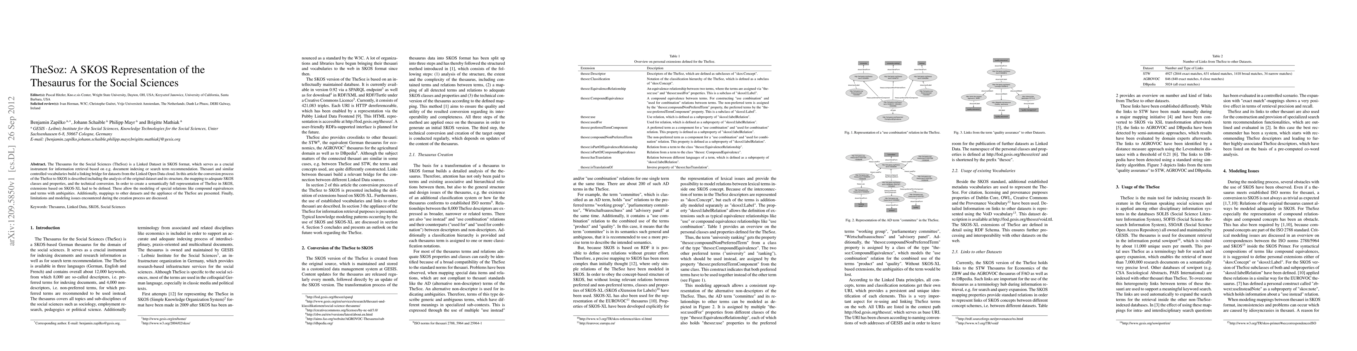 The paper details the conversion of the Thesaurus for the Social Sciences (TheSoz) into a SKOS format, enhancing its utility for information retrieval and linking it to other datasets in the Linked Open Data cloud. It discusses the technical conversion process and presents mappings to other datasets, along with limitations and modeling issues encountered.