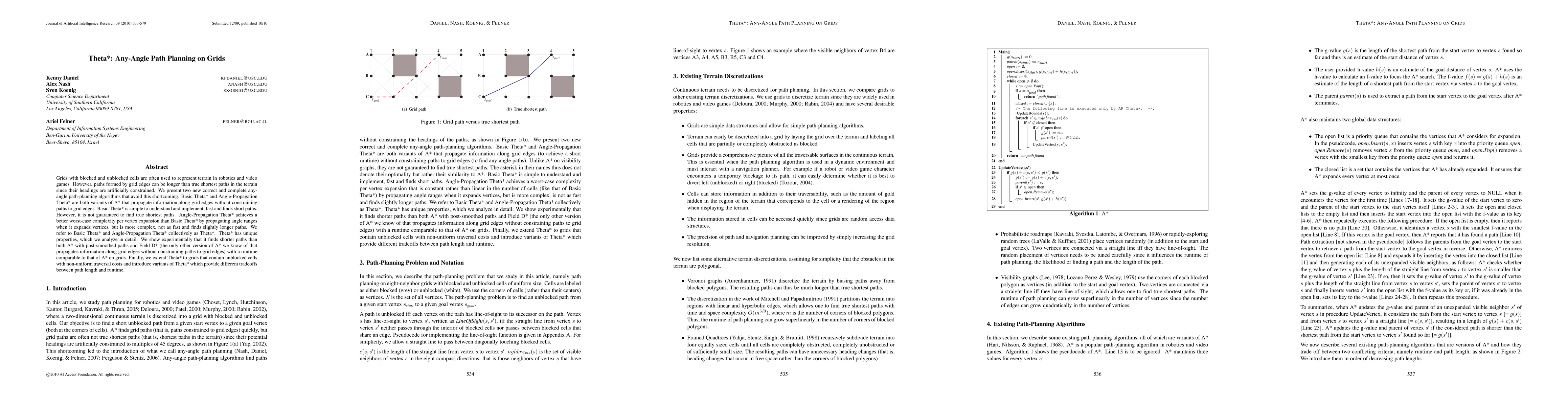 This paper presents two variants of the Theta* algorithm for any-angle path planning on grids, addressing the limitation of grid-edge constrained paths. Basic Theta* is simple and fast but not guaranteed to find the shortest path, while Angle-Propagation Theta* offers better worst-case complexity but is more complex and slower. Theta* outperforms A* and Field D* in path length with comparable runtime.