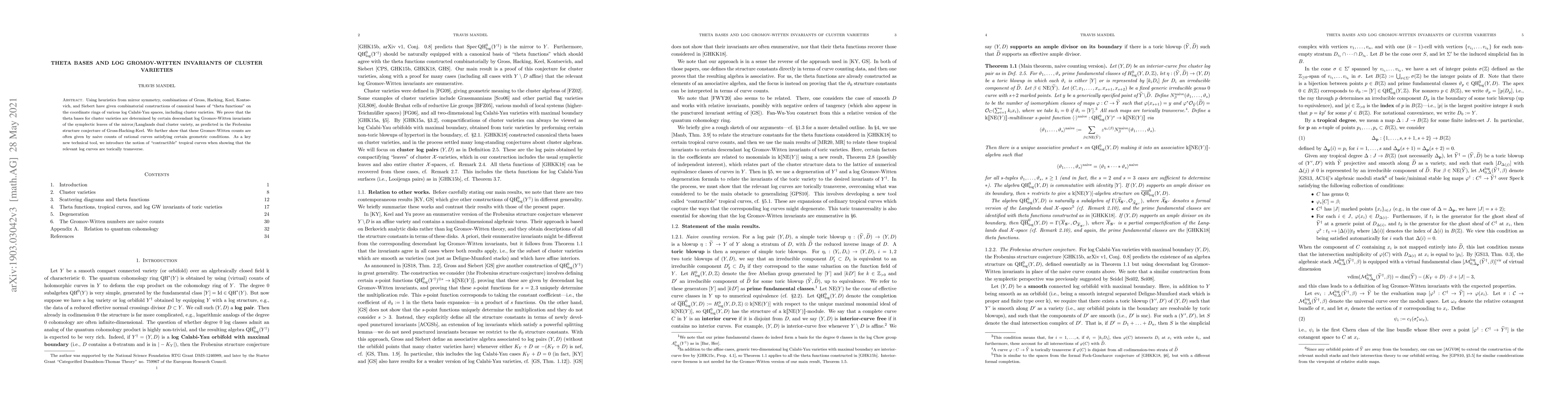 This paper constructs canonical bases of "theta functions" on cluster varieties using mirror symmetry, showing they are determined by descendant log Gromov-Witten invariants of symplectic leaves, and introduces "contractible" tropical curves to prove toric transversality.