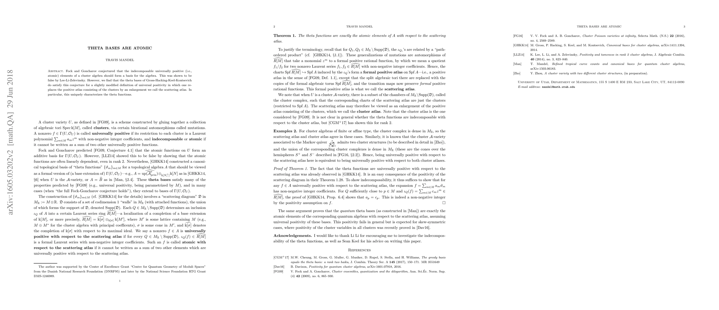 Summary: The paper proves that theta bases satisfy a modified version of the Fock-Goncharov conjecture, confirming the indecomposability and universal positivity of these bases within a new framework called the scattering atlas, which uniquely characterizes theta functions.