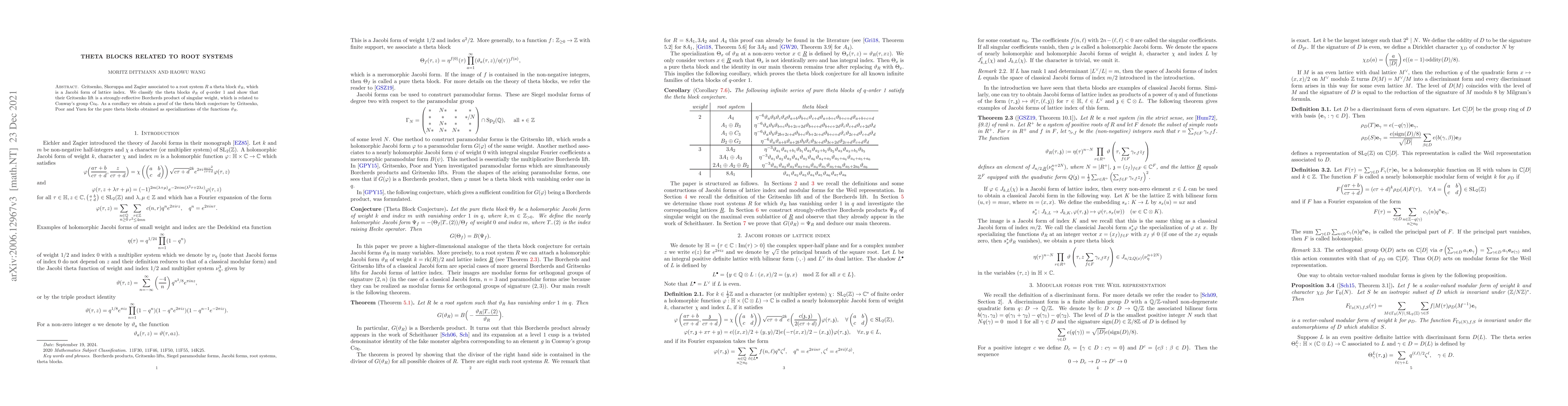 Gritsenko, Skoruppa and Zagier associated to a root system $R$ a theta block $\vartheta_R$, which is a Jacobi form of lattice index. We classify the theta blocks $\vartheta_R$ of $q$-order $1$ and show that their Gritsenko lift is a strongly-reflective Borcherds product of singular weight, which is related to Conway's group $\operatorname{Co}_0$. As a corollary we obtain a proof of the theta block conjecture by Gritsenko, Poor and Yuen for the pure theta blocks obtained as specializations of the functions $\vartheta_R$.