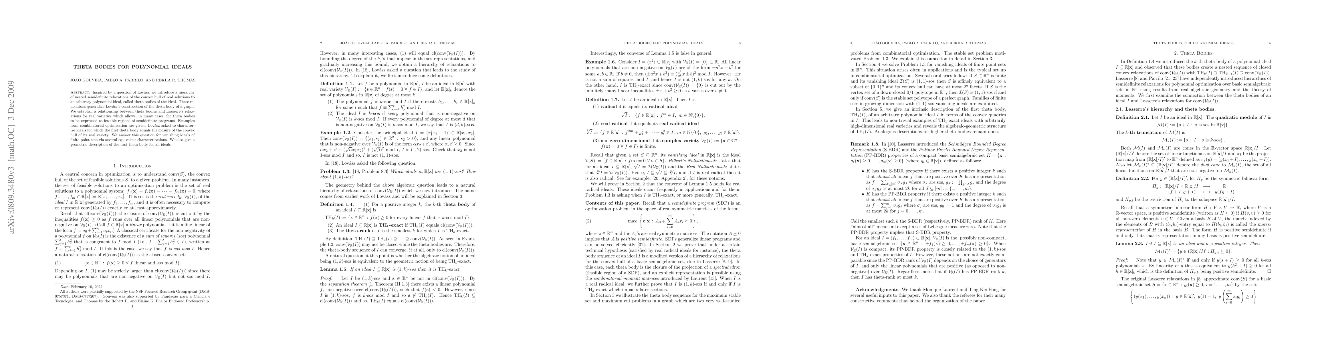 This paper introduces theta bodies, a hierarchy of nested semidefinite relaxations for polynomial ideals, addressing a question by Lovász. The first theta body equals Lovász's theta body for the stable set problem in graphs. Theta bodies are computationally explicit via combinatorial moment matrices and offer new semidefinite relaxations for the max cut problem. The paper also provides conditions for the first theta body to match the convex hull of finite point sets and determines the structure of the first theta body for all ideals.
