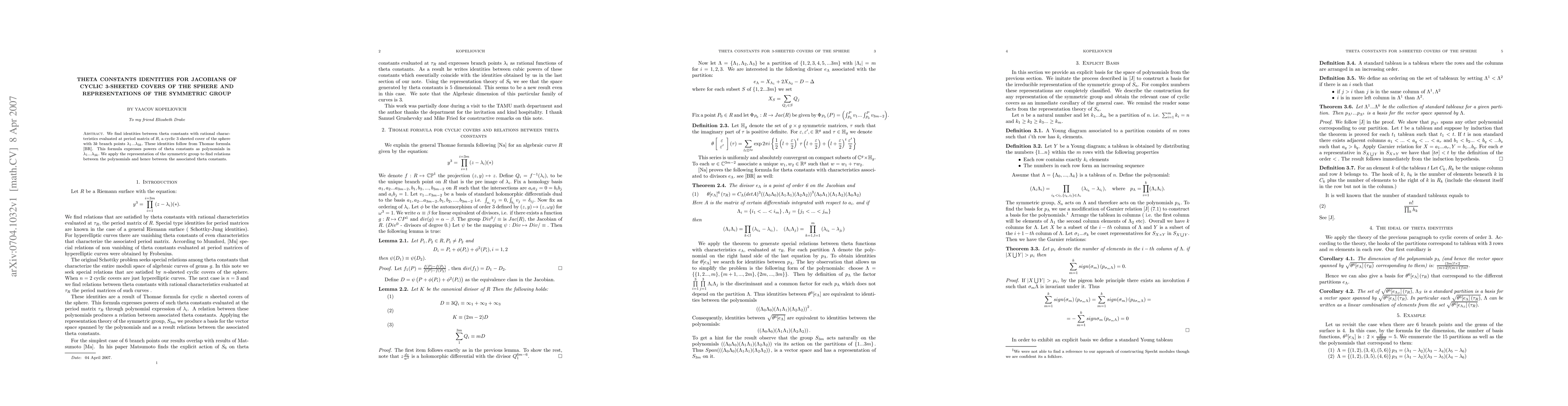 This paper identifies identities among theta constants evaluated on a cyclic 3-sheeted cover of the sphere, derived from Thomae's formula. It uses the symmetric group's representation to establish relations between these constants and associated polynomials.