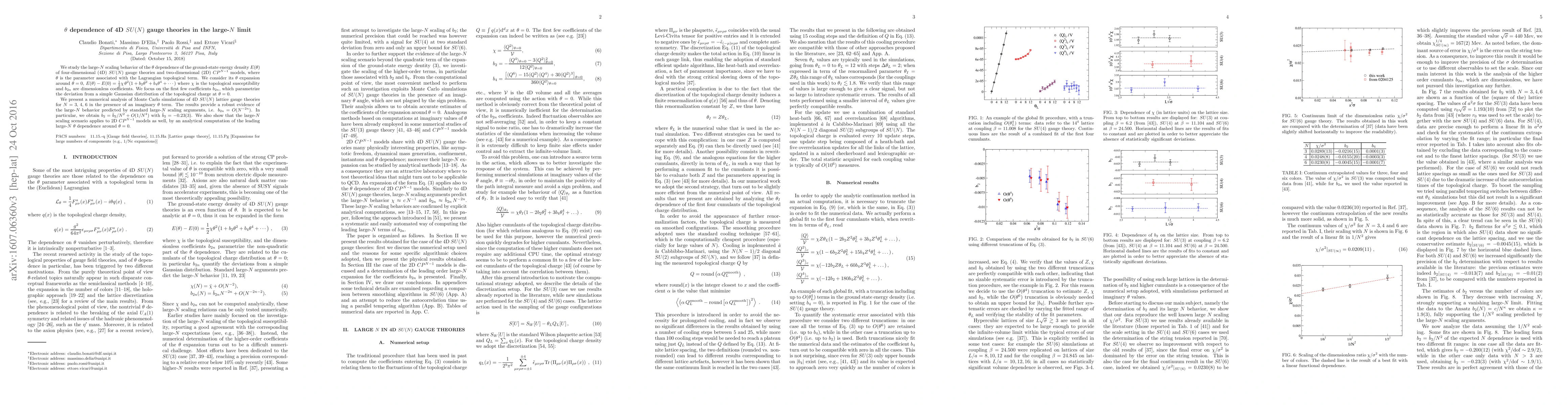 This paper investigates the large-$N$ scaling behavior of the $\theta$ dependence in 4D $SU(N)$ gauge theories, focusing on coefficients $b_{2n}$ that quantify deviations from Gaussian topological charge distributions. Numerical simulations confirm the predicted $b_{2n}= O(N^{-2n})$ scaling, with $b_2$ specifically calculated as $b_2=\bar{b}_2/N^2 + O(1/N^4)$, where $\bar{b}_2=-0.23(3)$. The large-$N$ scaling is also shown to apply to 2D $CP^{N-1}$ models.