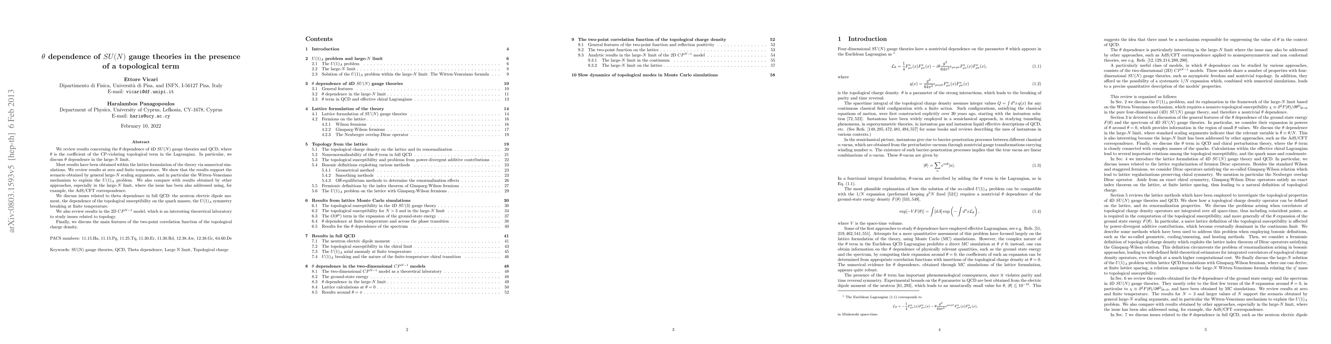 This paper reviews the theta dependence in 4D SU(N) gauge theories and QCD, focusing on the large-N limit and employing lattice simulations to study the topological charge distribution. It supports the Witten-Veneziano mechanism for the U(1)_A problem and discusses implications for the neutron electric dipole moment and topological susceptibility.