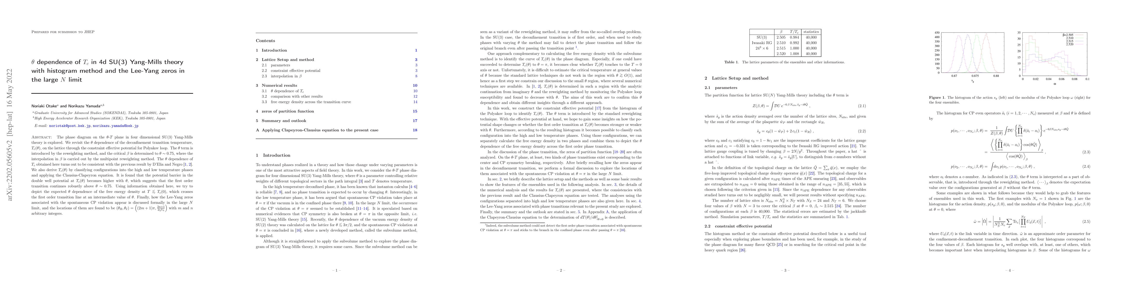 This paper investigates the $\theta$ dependence of the deconfinement transition temperature $T_c$ in 4d SU(3) Yang-Mills theory using the histogram method and Lee-Yang zeros in the large $N$ limit. The study finds that the transition remains first-order for $\theta \sim 0.75$ and discusses the appearance of spontaneous CP violation through the Lee-Yang zeros.