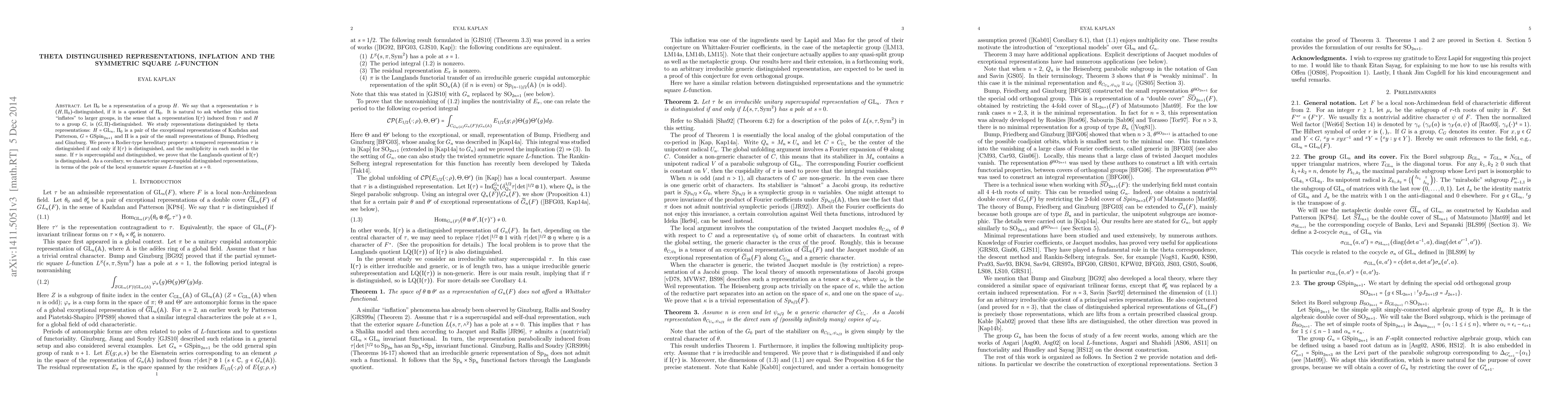 Let $\Pi_0$ be a representation of a group $H$. We say that a representation $\tau$ is $(H,\Pi_0)$-distinguished, if it is a quotient of $\Pi_0$. It is natural to ask whether this notion "inflates" to larger groups, in the sense that a representation $\mathrm{I}(\tau)$ induced from $\tau$ and $H$ to a group $G$, is $(G,\Pi)$-distinguished. We study representations distinguished by theta representations: $H=GL_n$, $\Pi_0$ is a pair of the exceptional representations of Kazhdan and Patterson, $G=GSpin_{2n+1}$ and $\Pi$ is a pair of the small representations of Bump, Friedberg and Ginzburg. We prove a Rodier-type hereditary property: a tempered representation $\tau$ is distinguished if and only if $\mathrm{I}(\tau)$ is distinguished, and the multiplicity in each model is the same. If $\tau$ is supercuspidal and distinguished, we prove that the Langlands quotient of $\mathrm{I}(\tau)$ is distinguished. As a corollary, we characterize supercuspidal distinguished representations, in terms of the pole of the local symmetric square $L$-function at $s=0$.