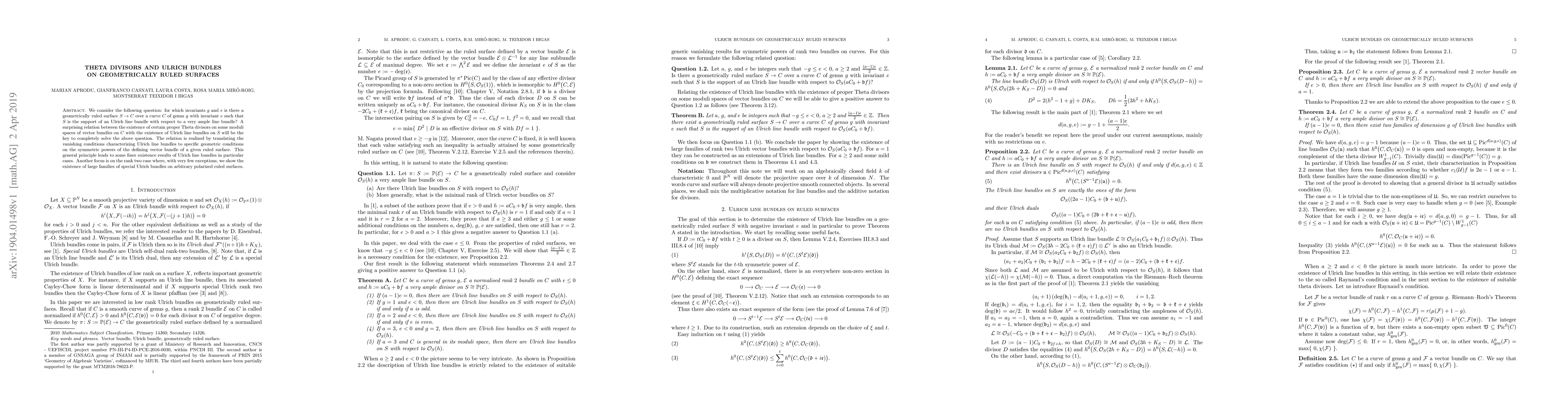 This paper investigates the existence of Ulrich line bundles on geometrically ruled surfaces over a base curve, focusing on the invariants genus $g$ and $e$. It establishes a surprising link between the presence of specific Theta divisors on moduli spaces of vector bundles and the existence of Ulrich line bundles, providing a comprehensive solution to the problem and identifying large families of special Ulrich bundles for rank two cases.